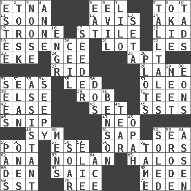 ACROSS 1. Inactive volcano in Sicily 5. Snakelike fish 8. Small child 11. Within a short period 12. Advice 14. Alias (abbr.) 15. Heavy duty weighing machine 17. Vertical member of a panel or frame 18. Flaplike covering 19. Core 21. Car dealer's back yard 22. French article 23. Supplement with great effort 24. Unit of force equal to gravity 25. Fitting 27. To free from 28. Unable to walk 31. Oceans 35. Directed 37. Margarine 38. Otherwise 39. Director Reiner 41. Adolescent 42. Comfort 43. Put into a specified state 45. Fast planes 46. Clip 47. Modern: prefix 49. Symbol (abbr.) 51. Plant excrement 52. Ocean 55. Plant holder 57. Compass dir. 60. Speakers 62. Santa ___, CA 63. Pitcher Ryan 65. Rings 66. Lair 67. Ketch in the Levant 68. Ancient Persian 69. Fast jet (abbr.) 70. To separate or throw off 71. Paradise DOWN 1. First name in cosmetics 2. Cod relative 3. Trap for birds or small mammals 4. Singer Murray 5. Consume 6. Tending to cause great harm 7. _ and Stitch 8. Baron Munchausen's specialties 9. Migrant worker of the '30s 10. Bits 13. Stalk of a moss capsule 16. Engineer (abbr.) 17. Sowing specialist 20. To provide with a ceiling 26. Small pieces of grounds 29. Rendezvous 30. Immeasurably long periods of time 31. Observes 32. Enthusiasm 33. Helper 34. Not well drained, as in land 36. Two (Sp.) 40. Gillaume's butler role 44. Lacerate 48. Brightly colored fish 50. Not women's 52. Having a sole or soles 53. Wear away 54. NE Netherlands city 55. Groovy apts. 56. Singles 58. Fly high 59. Writer Wiesel 61. Not wild 64. Adept person