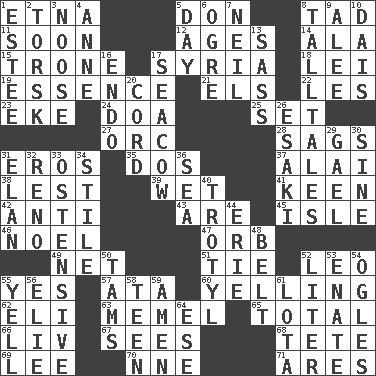 ACROSS 1. Inactive volcano in Sicily 5. Spanish title 8. Small boy 11. Within a short period 12. Grows older 14. In the manner of 15. Marketplace scale 17. Damascus' land 18. Flowery wreath 19. Gist 21. Raised railways 22. French article 23. Make supply last 24. ___ good deed 25. Put into a specified state 27. The grampus (Milton) 28. Sinks 31. Greek god of love 35. Two (Sp.) 37. Jai ____ 38. For fear that 39. Dripping 41. Peachy ____! 42. Opposed to 43. "We ___ not amused" (Victoria) 45. Small island 46. Christmas carol 47. Globe 49. Fish or hair follower 51. Make a knot 52. Lion 55. It is so 57. "One Day ___ Time" 60. Crying or shouting loudly 62. Biblical high priest 63. Klaipeda city 65. Add up to 66. 54 in ancient Rome 67. Perceives with the eye 68. False hair 69. Area sheltered from the wind 70. Compass dir. 71. Ancient Greek god of war DOWN 1. First name in cosmetics 2. Cod relative 3. Trap for birds or small mammals 4. Singer Murray 5. 24 hours 6. Legendary monster 7. Famous astronaut Armstrong 8. Baron Munchausen's specialties 9. Toward shelter 10. Raised platform 13. Backtalk 16. Inside; within (prefix) 17. Manatee 20. Drawstring 26. 1973 Nobel Price Winner (Physics) Leo 29. Highlander 30. Trig term 31. Flair 32. Western Nevada city 33. Clearly or manifestly demonstrative 34. Vertical member of a panel or frame 36. Ocean 40. Trinitrotoluene 44. 4th largest of the Great Lakes 48. Waist strap 50. Scottish caps 52. 61 cubic inches 53. Related on the mother's side 54. Stares at amorously 55. Shout 56. Writer Wiesel 58. Adolescent 59. So be it 61. Globular water bottle used in Asia 64. Compass dir.