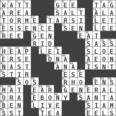 ACROSS 1. Electrical Unit 5. Turn to the right 8. Label 11. Type of rug 12. Table seasoning 14. Chicken ___ king 15. Singer Mel 17. Tarsus (plural) 18. Allow 19. Core 21. Elected rep. 22. Area sheltered from the wind 23. To separate or throw off 24. Commissioned mil. rank 25. Ingest 27. To free from 28. Backtalk 31. Pile 35. Flowery wreath 37. A type of plum 38. Celtic language 39. Heredity factor (abbr.) 41. Age 42. Political cartoonist Thomas 43. Santa ___, CA 45. Is not 46. Tumult 47. Compass dir. 49. Distress signal 51. 17th letter of the Greek alphabet 52. Followers of ems 55. Floor protector 57. Hearing organ 60. Commissioned military rank 62. Mouth or opening 63. Black 65. Before Barbara or Clara 66. Benjamin's nick name 67. Not recorded 68. Thailand, formerly 69. Fast jet (abbr.) 70. Afternoon social gathering 71. Snakelike fish DOWN 1. Wetness 2. Came up 3. Laconic 4. Docile 5. Girls' org. (abbr.) 6. Hearing organs 7. Otherwise 8. Baron Munchausen's specialties 9. Toward shelter 10. Yard entry 13. Prong on a fork 16. Engineer (abbr.) 17. Watched over 20. To provide with a ceiling 26. Slender Brazilian palm 29. Within a short period 30. Emitted 31. Coop moms 32. Part of Q.E.F. 33. Helper 34. Stone: prefix 36. _ tizzy (2 wds.) 40. Disorder of the immune system 44. American tennis player Robert 48. Immeasurably long periods of time 50. Stitch closed the eyes of (a falcon) 52. Bert's buddy 53. Brizilian seaport 54. Hits or strikes with great force 55. Crowds into 56. Ancient Greek god of war 58. "This won't hurt ____!" 59. Be footloose 61. Relaxation 64. Teachers' org.