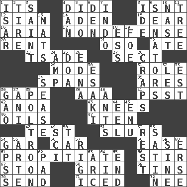 ACROSS 1. ___ a Wonderful Life 4. "You Light Up My Life" star Conn 8. Is not 12. Thailand, formerly 14. An important port of Yemen 15. Letter starter 16. Roberta Peters solo 17. Unrelated to defense, as in spending 20. Monthly bill 21. Bear (Spanish) 22. Had dinner 23. Sadhe (variant) 27. Religious group 29. Method 31. Hero or heavy, e.g. 34. Connects, as a bridge 35. Ancient Greek god of war 36. Yawn 39. Auto club (abbr.) 41. Inconspicuous attention getter 42. Small Philippine buffalo 43. Leg joints 46. Lubricates 47. A distinct part 48. Trial 51. Plays smoothly or legato 54. Slender fish 56. 4-wheeled motor vehicle 58. Relaxation 61. Appease 66. Commotion 67. Portico 68. Broad smile 69. Canisters 70. Transmit 71. On the rocks 72. Born DOWN 1. Austrian river, tributary to the Danube 2. Become fatigued 3. Virtuous person 4. One of the 12 tribes of Israel 5. Wedding promise 6. Lair 7. _ china 8. Binary compound 9. Legislators 10. Political cartoonist Thomas 11. Family _ (genealogy) 13. Floor protectors 18. Double-curved letter 19. Enemy 24. Electrical Unit 25. ___ good deed 26. Pulitzer Prize-winning author Ferber 28. Dice game 30. 1973 Nobel Price Winner (Physics) Leo 32. French article 33. Eastern Standard Time (abbr.) 34. Gospel singer Marvin 36. E Mali city 37. Cuckoo 38. Characterized by complete cowardliness 40. Pismires 44. Snakelike fish 45. Australian flightless bird 49. _-fi 50. Make lace 52. Repose 53. Smooth fabric 54. Global Positioning Systems (abbr.) 55. Johnson of "Laugh-In" 57. Swiss mountan, "Queen of the Mountains" 59. Trig term 60. Celtic language 62. Groovy apt. 63. Curve 64. Neckwear 65. Conclusion