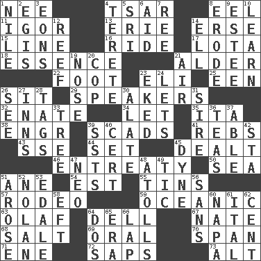 ACROSS 1. Born 4. Russian ruler of old 8. Snakelike fish 11. Composer Stravinsky 13. One of the Great Lakes 14. Celtic language 15. Actor's bit 16. Travel on or in a vehicle 17. Globular water bottle used in Asia 18. Substance 21. Tree or shrub in the Birch family 22. One third of a yard 23. Biblical high priest 25. Car or cant ending 26. Be seated 29. Orators 32. Maternal 34. Allow 35. Call ___ day 38. Engineer (abbr.) 39. Tons 41. Confederate soldiers (slang) 43. Compass dir. 44. Arrange properly for use 45. Started a card game 46. Plea 50. Ocean 51. A saturated hydrocarbon 54. Eastern Standard Time (abbr.) 55. Canisters 57. Cowboy competition 59. Pertaining to the sea 63. Norwegian king 64. Small valley 67. Nathan's nickname 68. Table seasoning 69. Of the mouth 70. Connect, as a bridge 71. Compass dir. 72. Plant excrements 73. Keyboard modifier key DOWN 1. Mediterranean tributary 2. Armor plate that protects the chest 3. Immeasurably long periods of time 4. Cigar-shaped 5. _ Lanka 6. Help 7. To sift 8. Wear away 9. First name in cosmetics 10. Acquire or gain knowledge or skills 12. Coral collection 14. Pipe bend 19. Characteristic smell of wine 20. Police officer (slang) 21. Atmosphere 23. Supplemented with great effort 24. Allows 26. Observe 27. Taverns 28. Labels 30. Having winglike extensions 31. Beget 33. Woody plant 36. Afternoon social gatherings 37. Competent 39. Fast planes 40. Foregone conclusion 42. R.R. building 45. Unit of force 47. Modern: prefix 48. Ringlike coral islands and reefs 49. Nervous spasm 51. Came up 52. Pitcher Ryan 53. Peak District village in England 56. Without 58. Lizard (obsolete) 60. California wine valley 61. Slanted text style (abbr.) 62. Penny 64. Two (Sp.) 65. Epoch 66. Pet locale