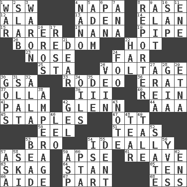 ACROSS 1. Compass dir. 4. California wine valley 8. To erase 12. In the manner of 13. An important port of Yemen 14. Flair 15. More uncommon 18. Grandmother 19. Corncob 20. Mood resulting from idleness 22. Being at a high temperature 23. Olfactory organ 24. At a great distance 25. R.R. building 26. Electrical Measurement 30. Girls' org. (abbr.) 33. Cowboy competition 36. Part of Q.E.F. 37. Rounded earthenware pot or jar 39. One more than two 40. It's straight from the horse's mouth 41. Inside of hand 42. American astronaut and politician John 44. American Automobile Association (abbr.) 45. Paper fasteners 47. Baseball player Mel 50. Snakelike fish 51. Beverages made from leaves 53. Sis' sibling 54. Under perfect conditions 57. At sea 59. Domed church section 61. Break or tear apart 63. Heroin 64. Comedian Laurel of Laurel & Hardy 65. "___ Little Indians" 66. Assistant 67. Piece 68. Double-curved letter DOWN 1. Armed conflict 2. Broad, flat, thick piece 3. Make _____ (do battle with) 4. Billionth: prefix 5. First man 6. Animal enclosure 7. Santa ___, CA 8. News announcer 9. Set down 10. Plant excrement 11. Compass dir. 16. Greek god of love 17. Take ten 21. Letter starter 22. Actor Linden 24. Egg _ yung 26. Distinctive style or manner 27. Type of rug 28. Greek goddess of the earth (variant) 29. Inactive volcano in Sicily 30. Republicans 31. Narrow board 32. Silent film actress Nazimova 34. Petroleums 35. Pass on 38. Electrical Measurement 42. Set 43. Short letter 46. Lion 48. Rend 49. Story 52. Schedule 53. Necklace unit 54. Austrian river, tributary to the Danube 55. Gouge 56. Jacques Cousteau's middle name 57. White ___ sheet 58. What Jean-Claude Killy likes to do 59. Viper 60. Parent Teacher Assoc. 62. Followers of ems