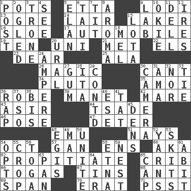 ACROSS 1. Plant holders 5. Singer James 9. Farming town in central California 13. Legendary monster 14. Den 15. Member of a famous L.A. basketball team 16. A type of plum 17. Car 19. "___ Little Indians" 20. Corn or form start 21. Was introduced to 22. Raised railways 23. Letter starter 25. In the manner of 26. Mysterious quality of enchantment 30. Patter 34. Cartoon dog 35. Mine, in Marseilles 36. Loose flowing garment 39. French painter Edouard 42. Female horse 43. SW Saudi Arabia district 44. Sadhe (variant) 46. Introduce or present, as a question 47. Prevent from occurring 48. Australian flightless bird 51. Negative votes 54. Sep. follower 57. Separate the seeds from cotton 58. Followers of ems 60. Alias (abbr.) 62. Conciliate 65. Baby bed with high sides 66. Ancient Roman robes 67. Metal containers 68. Opposed to 69. Connect, as a bridge 70. Part of Q.E.F. 71. Inconspicuous attention getter DOWN 1. Mail 2. Stared at amorously 3. Marketplace scale 4. Observe 5. Enthusiasm 6. "Change" in Tahitian 7. Teat (slang) 8. Odor 9. Experiment locale 10. Migrant worker of the '30s 11. Small valley 12. Angers 15. Globular water bottle used in Asia 18. Cartoonist voice _ Blanc 20. Mountain range 24. Electrical Unit 27. Chewing product 28. Call ___ day 29. Continued (abbr.) 30. Device for capturing images 31. Wet nurse (var.) 32. Not either 33. Make a knot 36. Strike 37. Bear (Spanish) 38. Again 40. Compass dir. 41. Make lace 45. Cub Scout units 48. Armor plate that protects the chest 49. Floor covering 50. Join together 52. Tall tales 53. Burlesque acts 54. Chooses 55. Riding implement 56. Ancient Roman robe 58. Inactive volcano in Sicily 59. A home for chicks 61. "This won't hurt ____!" 63. Baking dish 64. Atmosphere 65. Head covering