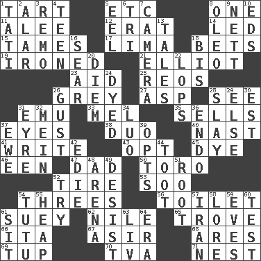 ACROSS 1. Small pie 5. And so on (abbr.) 8. Single 11. Toward shelter 12. Part of Q.E.F. 14. Directed 15. Corrects by punishment or discipline 17. Pale green bean 18. Antes 19. Pressed 21. American author Paul (1891-1958) 23. Assist 25. Vintage cars 26. Jennifer or Joel 27. Viper 28. Observe 31. Australian flightless bird 33. Cartoonist voice _ Blanc 35. Makes a sale 37. Snake ____ (dice throw) 38. Superhero pair 40. Political cartoonist Thomas 41. Compose 43. Elect 45. Color 46. Car or cant ending 47. Male parent 50. "Corrida" creature 52. Become fatigued 53. "Barney Miller" actor Jack 54. Threesomes 56. Bathroom 61. Chop _ 62. The longest river in the world 65. Collection of objects 66. Call ___ day 67. SW Saudi Arabia district 68. Ancient Greek god of war 69. Uncastrated adult male sheep 70. Federal power corp. 71. A home for chicks DOWN 1. Jacques of French films 2. Having or resembling wings 3. San ____ (Riviera town) 4. Adolescent 5. Snakelike fish 6. Three (prefix) 7. Device for capturing images 8. Butter sub 9. Remaining after all deductions 10. Begley and Asner 13. Falsehoods 16. Wither 18. Twice 20. South Vietnam president (1954) 22. Chops off 24. Colored 26. Abrupt rush of wind 28. Kill 29. Otherwise 30. Eastern Standard Time (abbr.) 31. Jane of fiction 32. Chow _ 34. Nilotic language 36. Inside; within (prefix) 37. She-sheep 39. Chooses 42. Singer Brickell 44. A blast of a horn 48. Sports stadium 49. Cease 51. Carrot, for example 52. Attempt 54. Ballerina skirt 55. Pile 57. SW Asia republic 58. Old wives' tales, e.g. 59. Nights before holidays 60. Trial 61. Be seated 63. 54 in ancient Rome 64. Epoch