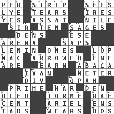 ACROSS 1. For each 4. Empty completely 9. Perceives with the eye 13. Potassium hydroxide 14. Separates forcefully 15. Angers 16. Consenting reply 17. Slender Brazilian palm 18. The longest river in the world 19. Title for a knight 21. Nine, plus one 22. Gurus 24. Hiding places for outlaws 26. Compass dir. 27. Sports stadium 29. Plant excrements 30. Soviet premier 1918-24 31. Singles 33. Chop off 36. Big _ 37. Moved like an arrow 40. Compass dir. 41. "We ___ not amused" (Victoria) 42. Merit 43. Phillipine bananalike plant 45. _ the terrible 47. Distance measurement 48. HTML Container Element 49. Brightly colored fish 50. A-one 52. Third mo. 54. Lair 56. Margarine 57. Singer Mel 59. Actress Charlotte 61. Penny 62. Satellite of Uranus 63. Followers of ems 64. Small amounts or degrees 65. Erodes 66. Two (Sp.) DOWN 1. Apply oneself diligently 2. Sight organs 3. Dwelling 4. R.R. building 5. Trials 6. Raze (variant) 7. SW Asia republic 8. Air pressure measure (abbr.) 9. Burns superficially 10. One of the Great Lakes 11. Snakelike fish 12. Compass dir. 20. Painter Guido (1575-1642) 22. Gospel singer Marvin 23. Cleo's killer 25. Nanny 27. _ mater 28. Tail end 29. Stitched 31. Northwest Algerian city 32. Not either 33. Tough but pliablecoriaceous 34. Single time 35. Lightbulb-shaped fruit 38. Rob, plunder, or pillage 39. Moist 44. Necklace unit 45. Foolish or stupid persons 46. Zeal 49. Channel Islands abalone 50. Entreaty 51. Tear apart 52. Greater amount 53. Operatic vocal solo 55. Billionth: prefix 56. Sep. follower 57. The 23rd letter of the Hebrew alphabet 58. Raised railways 60. Curvy letter