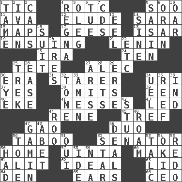 ACROSS 1. Nervous spasm 4. College mil. group 8. "Barney Miller" actor Jack 11. Actress Gardner 12. Evade 14. "Two Mules for Sister ____" 15. Atlas contents 17. Honkers 18. Austrian river, tributary to the Danube 19. Taking place subsequently 21. Soviet premier 1918-24 23. Lyricist Gershwin 24. Nine, plus one 25. Wig 27. Actor Baldwin 30. Period 31. A viewer who gazes fixedly 34. RI univ. 37. Consenting reply 38. Leaves out 39. Car or cant ending 40. Make supply last 41. Makes clutter 43. Directed 44. French philosopher Descartes 45. Unclean, religiously 47. E Mali city 49. Superhero pair 50. Off limits 52. Elected representative 56. Dwelling 57. National forest in Provo, Utah 60. Cause to be 61. Set down 62. Perfect 63. Flaplike covering 64. Lair 65. Hearing organs 66. Corporate head (abbr.) DOWN 1. Docile 2. _ the terrible 3. Smile enhancers 4. Rain (Swedish) 5. Cassini of fashion 6. Third day of the wk. 7. Music discs 8. Indian antelope 9. Northwest Algerian city 10. Boat paddle 13. Snakelike fish 14. Trig term 16. Set or collection 20. Angers 22. And so on (abbr.) 25. Long journey 26. Comfort 27. Ascend 28. Allows 29. Celtic language 30. Sight organ 32. Heavy book 33. So be it 34. Ubangi River tributary 35. Coral collection 36. Working for oneself (abbr.) 42. Make senseless or dizzy 44. Friend of Pooh 46. Wander aimlessly 47. Street urchin 48. Collude with 49. Allots cards 50. Lacquered or enameled metalware 51. Fr. "Yes" 52. Play the lead 53. Baby powder 54. Migrant worker of the '30s 55. Redecorate 56. Possessed 58. Binary compound 59. Teachers' org.