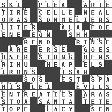 ACROSS 1. What Jean-Claude Killy likes to do 4. Entreaty 8. Johnson of "Laugh-In" 12. Become fatigued 14. Cell (Danish) 16. Anneal 17. Mouths or openings 18. Wine waiters 20. 61 cubic inches 22. Wing 23. Enemy 24. Compass dir. 25. Period of immesurable duration 28. Quiet! 30. Western Nevada city 31. Wash lightly 35. "We ___ not amused" (Victoria) 37. Celtic language 40. Travels 41. One who uses or employs something 42. Feeling sharp psychological pain 44. Coop moms 45. Tall New Zealand timber tree 46. Pile 47. Raised railways 48. Removes the wrinkles 50. Russian ruler of old 52. Distress signal 54. Eastern Standard Time (abbr.) 55. Health resort 58. Part of HMS, perhaps 61. Luau accessory 63. Vices 65. Pleas 70. Ancient river in northeast Turkey 71. Portico 72. Before Barbara or Clara 73. False hair 74. Drink excessively 75. Made of lace 76. Elected rep. DOWN 1. Fur scarf 2. Japanese brewing company 3. Feeling or showing extreme anger 4. Personal Computers (abbr.) 5. Lion 6. Shade tree 7. _ mater 8. Cuckoo 9. Coral ridge 10. Pacific island yam 11. Otherwise 13. Compass dir. 15. Snakelike fish 19. Cowardly lion portrayer 21. To riddle 26. Singles 27. _ pole 29. Having greater elevation 30. Summer TV shows 32. Christmas carol 33. Elected reps. 34. Curvy letter 35. SW Saudi Arabia district 36. San ____ (Riviera town) 38. Institute legal proceedings 39. Maternal 41. RI univ. 43. Global Positioning Systems (abbr.) 49. Flatfish 51. Had dinner 53. Oceans 55. Begets 56. Food holder 57. NE Netherlands city 58. Command 59. To the inside or interior of 60. Close up, plug up 62. Slanted text style (abbr.) 64. Large container 66. Actress Charlotte 67. _ tizzy (2 wds.) 68. And so on (abbr.) 69. Declare