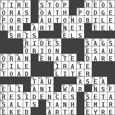 ACROSS 1. Become fatigued 5. Discontinue 9. Vintage cars 13. Mouths or openings 14. Pledge 15. Puddle 16. Left side of a ship or aircraft 17. Car 19. Compass dir. 20. Nonscientific branch of learning 21. Fish or hair follower 22. Snakelike fish 23. Indian titles of respect 25. Raised railways 26. Amusement-park features 30. Settles 34. Greek mythologigal hunter 35. He sold his birthright 36. Northwest Algerian city 39. Maternal 42. Have the gumption 43. Do some clerical work 44. Feeling or showing extreme anger 46. Frog relative 47. 61 cubic inches 48. The 19th letter of the Greek alphabet 51. At sea 54. Connecticut Ivy Leaguer 57. Black tropical American cuckoo 58. Armed conflict 60. Overdraft (abbr.) 62. Dwellings 65. Bristle 66. Table seasonings 67. Hyperbolic tangent 68. Arab leader 69. Made supply last 70. Johnson of "Laugh-In" 71. Jane of fiction DOWN 1. Drink excessively 2. Metal shackles 3. More valued for its uncommonness 4. Eastern Standard Time (abbr.) 5. Fly high 6. Tense 7. Baseball player Mel 8. Give a jingle 9. Director Reiner 10. Singer Brickell 11. Stare at amorously 12. Sew up the eyelids of hawks and falcons 15. Plant holders 18. Cartoonist voice _ Blanc 20. SW Saudi Arabia district 24. Pressed 27. Pass on 28. Age 29. Slow-paced one 30. Spring feasts 31. White ___ sheet 32. Slender fish 33. Take to court 36. Often (poetically) 37. River (Sp.) 38. According to 40. Three (prefix) 41. Erode 45. Pull apart 48. Bits 49. A saturated hydrocarbon 50. National forest in Provo, Utah 52. Foe 53. Moving or stirring 54. Celtic language 55. Path through which fluid escapes 56. Capri or Wight 58. Left 59. American tennis player Robert 61. Conductor's collection 63. It would 64. Auto 65. Perceive with the eye