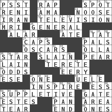 ACROSS 1. Inconspicuous attention getter 5. Strike 8. Blemish 12. Painter Guido (1575-1642) 13. Nursemaid (var.) 14. Trap for birds or small mammals 15. SW Asia republic 16. Household entertainment appliance 19. Medical imaging device (abbr.) 20. Commissioned military rank 21. Having or resembling wings 23. Had dinner 24. Make lace 27. Balmoral and tarboosh 30. Friends 31. Motion picture awards 34. Rounded earthenware pot or jar 35. Play the lead 38. Killed 40. Lightbulb-shaped fruit 41. (Had) reclined 42. Cylindrical with tapered ends 44. Probability 45. Suggestive of the supernatural 46. Compass dir. 47. Single 50. Ubangi River tributary 53. Stimulate to action 57. Double-curved letter 59. Supplying deficiencies 63. Yard entry 64. _____ Park, CO 65. Baking dish 66. Length times width 67. Separate forcefully 68. Conclude 69. Singles DOWN 1. Demure 2. Father Junipero _ 3. Slow-paced one 4. Metal container 5. Pace 6. So be it 7. Light colored 8. Distress signal 9. Luau course 10. Bear (Spanish) 11. "___ Little Indians" 14. Mediterranean tributary 17. Period 18. Large container 20. Pate de foie ____ 22. Oak nuts 24. Falsehood 25. Silent film actress Nazimova 26. Russian ruler of old 28. Personal Computers (abbr.) 29. Table seasoning 30. Wimpy's pal 32. Actress Charlotte 33. Father 35. A type of plum 36. Small amounts or degrees 37. Assistant 39. Born 43. Loyal 47. Lubricates 48. Compass dir. 49. Eastern Standard Time (abbr.) 51. Memorize 52. First name in cosmetics 54. Corncob 55. "Terrible" tsar 56. Tear apart 58. Oceans 59. Put into a specified state 60. Purpose 61. Parent Teacher Association (abbr.) 62. For each 63. E Mali city