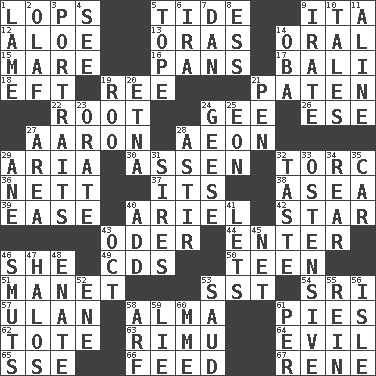 ACROSS 1. Chops off 5. Event that recurs at intervals 9. Call ___ day 12. _ vera 13. Mouths or openings 14. Taken by mouth 15. Female horse 16. Baking dishes 17. Indonesian resort city 18. Bank Draft (abbr.) 19. To separate or throw off 21. Eucharist need 22. Carrot, for example 24. Turn to the right 26. Compass dir. 27. Composer Copland 28. Period of immesurable duration 29. Operatic vocal solo 30. NE Netherlands city 32. Torque (variant) 36. Remaining after all deductions 37. ___ a Wonderful Life 38. At sea 39. Comfort 40. Satellite of Uranus 42. Play the lead 43. Baltic tributary 44. Keyboard key 46. A female animal or person 49. Music discs 50. Adolescent 51. French painter Edouard 53. Fast jet (abbr.) 54. _ Lanka 57. Uhlan (variant) 58. _ mater 61. Sliced desserts 62. Haul 63. Tall New Zealand timber tree 64. Tending to cause great harm 65. Compass dir. 66. Nourish 67. French philosopher Descartes DOWN 1. Unable to walk 2. Norwegian king 3. Likenesses of persons 4. Perceive with the eye 5. Drink excessively 6. Retirement account (abbr.) 7. Daniel's nick name 8. Double-curved letter 9. Feeling or showing extreme anger 10. Stories 11. Place in a line 14. Chief or king in Benin or Nigeria 19. Friend of Pooh 20. Inactive volcano in Sicily 21. Animal enclosure 23. Declaim 24. Honkers 25. Age 27. Type of rug 28. Having gotten out of bed 29. One (Scot) 31. Begets 32. Clothes sense 33. Clearly or manifestly demonstrative 34. Stern 35. Auto 40. Find the sum of 41. Allows 43. Sep. follower 45. Fish or hair follower 46. Particles of soot 47. Radiant circles of light 48. Related on the mother's side 52. Compass dir. 53. Saudi Arabian king (1953-1964) 55. It's straight from the horse's mouth 56. Capri or Wight 58. Sandy's bark 59. Untruth 60. Madame (abbr.) 61. For each