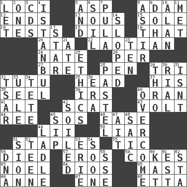 ACROSS 1. Event scenes 5. Viper 8. First of billions? 12. Conclusions 13. Horse sense 15. Not divided or shared with others 16. Trials 18. Deli pickle 19. Not this but _ 20. _ moment's notice (2 wds.) 22. Of or relating to Laos or its people 24. Nathan's nickname 26. For each 27. Cy Young winner Saberhagen 28. Animal enclosure 29. Three (prefix) 32. Ballerina skirt 35. Froth on beer 37. Part of HMS, perhaps 38. Stitch closed the eyes of (a falcon) 39. Big collection agency 40. Northwest Algerian city 41. Keyboard modifier key 42. Leave at once 43. Electrical Unit 44. To sift 45. Distress signal 46. Relaxation 49. Cards in a Roman deck? 50. One who doesn't tell the truth 51. Paper fasteners 55. Nervous spasm 56. Passed on 57. Greek god of love 59. Popular sodas 63. Christmas carol 64. "Vaya con ____" 65. Vertical spar for supporting sails 66. Singer Murray 67. Compass dir. 68. Singer James DOWN 1. Allow 2. Single 3. Music discs 4. Byzantium, centuries later 5. Also 6. Earth 7. Monetary unit of Botswana 8. Being in motion 9. Capital of the state of Qatar 10. ____ Jay Lerner 11. Was introduced to 14. Slanted 17. Play the lead 21. Had dinner 23. Nine, plus one 25. Value system 28. Soft color 29. Through, poetically 30. Monetary unit of Yemen 31. Is not 32. Russian ruler of old 33. Ubangi River tributary 34. False hair 36. Epoch 40. Conquer 42. Dirtied 45. Small drink 47. Small island 48. Ketch in the Levant 49. Dipping utensil 51. The Jewish people; Israel 52. Adolescent 53. One of the Great Lakes 54. Within a short period 56. Heredity factor (abbr.) 58. Compass dir. 60. Krazy ___ of comics 61. Eastern Standard Time (abbr.) 62. R.R. building