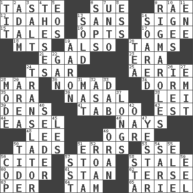 ACROSS 1. Clothes sense 6. Take to court 9. Actress Charlotte 12. Potato state 13. Without 14. Attach a signature 15. Falsehoods 16. Elects 17. Double curve, resembling the letter S 18. Mountains (abbr.) 19. In addition 20. Scottish caps 21. Mild oath 23. Period 24. Russian ruler of old 25. Nest on high 28. Spoil 30. Wanderer 34. Dormintory (informal) 35. Mouth or opening 36. Rhinal 38. Flowery wreath 39. Lairs 41. Off limits 43. Eastern Standard Time (abbr.) 44. Artist's stand 46. Negative votes 48. Area sheltered from the wind 49. Legendary monster 50. Small boys 51. Blunders 53. Compass dir. 56. Quote 57. Portico 58. Lacking originality or spontaneity 60. Scent 61. Comedian Laurel of Laurel & Hardy 62. Laconic 63. For each 64. Scottish cap 65. Satellite of Uranus DOWN 1. Teat (slang) 2. First of billions? 3. Table seasoning 4. College papers 5. Greek goddess of the dawn 6. Plant excrements 7. To (old English) 8. Curvy letter 9. Complicated, petty procedures 10. Ripens 11. Compass dir. 13. Disposed of to a purchaser 14. Flew 19. Composer Copland 20. Beverage made from leaves 22. Separate the seeds from cotton 24. Interpreter 26. Angers 27. Send forth 28. Method 29. Length times width 31. Floor covering 32. White ___ sheet 33. Small moist lump or mass 37. Yearns 40. Sowing specialist 42. Rowing implement 45. French article 47. Of or pertaining to yesterday 49. NW Algerian seaport 50. Event that recurs at intervals 51. Singer James 52. Wander 54. Indian skirt 55. Otherwise 56. Police officer (slang) 57. Fast jet (abbr.) 58. R.R. building 59. Snakelike fish