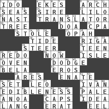 ACROSS 1. Wedding promise 4. Supplements with great effort 8. Bowlike part 12. Oceans 14. Father 15. _ and Stitch 16. Political cartoonist Thomas 17. Interpreter 20. Woody plant 21. ___ good deed 22. Accounting whiz (abbr.) 23. Fur scarf 27. Brightly colored fish 29. Periodic rise and fall of the sea level 31. Port city in Latvia 34. Guide 35. Adolescent 36. Make new 39. Immediately 41. Capri or Wight 42. Baking chamber 43. Evade 46. Actor Lugosi 47. Greek god of love 48. Ancient Greek god of war 51. Maternal 54. Put into a specified state 56. Lion 58. _ the terrible 61. The property of being fit to eat 66. Light colored 67. Small Philippine buffalo 68. Smile enhancers 69. It may be bright or harebrained 70. Austrian-born American filmmaker Fritz 71. Part of Q.E.F. 72. Snakelike fish DOWN 1. Is not 2. Letter starter 3. Fertile tracts in a desert 4. Eastern Standard Time (abbr.) 5. Apertif with cassis 6. Period 7. Transmit 8. Wing 9. Actors Guy, Robert Welles, and Clint 10. Hoof sound 11. Israeli folk dance 13. Proofreading order 18. "Barney Miller" actor Jack 19. Infant locale 24. Baseball player Mel 25. Falsehood 26. Locale of original sin 28. Nick name for Arthur 30. Eat (away) 32. Set 33. One (Scot) 34. Echolocation 36. Director Reiner 37. First lady 38. Conveyance 40. Had on 44. Spanish title 45. Girls' org. (abbr.) 49. Pipe bend 50. Observe 52. Native american tent (variation) 53. Elude 54. Lick closed 55. Pulitzer Prize-winning author Ferber 57. At one time in the past 59. Toward shelter 60. Actress Patricia 62. Container for groceries 63. Ewer handle 64. Health resort 65. Fast jet (abbr.)