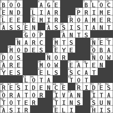 ACROSS 1. Sometimes accompanies a hiss 4. Ripen 7. Group of countries in special alliance 11. Conclude 12. One who doesn't tell the truth 13. A-one 14. Area sheltered from the wind 15. Arab leader 16. Wanderer 17. NE Netherlands city 19. Helper 21. Republican Party 23. Pismires 24. Drug cop 25. Mountains (abbr.) 26. Fish or hair follower 29. Methods 30. Sight organ 31. Chief or king in Benin or Nigeria 32. Two (Sp.) 33. Not either 34. Immediately 35. "We ___ not amused" (Victoria) 36. Cut the grass 37. Ingested 40. Consenting reply 41. Raised railways 42. Go away! 43. Globular water bottle used in Asia 45. Small child 46. Home 51. Amusement-park features 55. Speaker 56. _ the terrible 58. Call ___ day 59. Carrier 60. Canisters 61. Player for Phoenix 62. SW Saudi Arabia district 63. Biblical high priest 64. Part of HMS, perhaps DOWN 1. Actor Lugosi 2. Washington bills 3. Lyric poems 4. Direct toward a target or goal 5. Greek goddess of the earth (variant) 6. Blunders 7. Naughty children 8. Pale green bean 9. Presage 10. Foregone conclusion 12. Poe poem 13. Mail 16. Wash lightly 18. Mild oath 20. Letch 22. Personal Computers (abbr.) 24. Olfactory organs 25. Catcalls? 26. Music written for nine 27. Inky black, to poets 28. The 23rd letter of the Hebrew alphabet 29. Greater amount 32. 24 hours 33. Pitcher Ryan 36. Distance measurement 37. Eastern Standard Time (abbr.) 38. Oak nuts 39. Jacques of French films 43. 61 cubic inches 44. Scent 46. Roll call or roster of names 47. Greek god of love 48. Suttee (variant) 49. Quote 50. Morally bad or wrong 52. Food container 53. Needle case 54. Without 57. Cuckoo