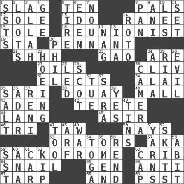 ACROSS 1. Volcanic refuse 5. Nine, plus one 8. Friends 12. Not divided or shared with others 13. Wedding promise 14. Indian princess (variant) 15. Lacquered or enameled metalware 16. One who advocates reunion 19. R.R. building 20. Pre-World Series prize 21. Quiet! 23. E Mali city 24. "We ___ not amused" (Victoria) 27. Lubricates 30. 154 in Roman numerals 31. Opts 34. Jai _ 35. Indian skirt 38. A city in N France, SE of Calais 40. Shopping center 41. An important port of Yemen 42. Cylindrical with tapered ends 44. Austrian-born American filmmaker Fritz 45. SW Saudi Arabia district 46. Three (prefix) 47. The 23rd letter of the Hebrew alphabet 50. Negative votes 53. Speakers 57. Alias (abbr.) 59. Italian handbag shop? 63. Baby bed with high sides 64. Slow-paced one 65. Commissioned mil. rank 66. Against 67. Canvas cover 68. Added to 69. Inconspicuous attention getter DOWN 1. Fast planes 2. Plunders 3. Assad's deity 4. Turn to the right 5. Hoop that covers a wheel 6. Paradise 7. Part of speech 8. Baking dish 9. Black tropical American cuckoo 10. French article 11. Put into a specified state 14. Printing process, for short 17. Tired old horse 18. _ tizzy (2 wds.) 20. Silvers or Donahue 22. Cultivating 24. Silent film actress Nazimova 25. Monetary unit of Yemen 26. Tending to cause great harm 28. Directed 29. Highlander 30. Device for capturing images 32. Third day of the wk. 33. "Two Mules for Sister ____" 35. Table seasoning 36. The sixth month of the Jewish calendar 37. Painter Guido (1575-1642) 39. Affirmative reply 43. Airtight sealed metal containers 47. Implement 48. Sandy's bark 49. Armed conflict 51. Entertaining tales 52. Burlesque acts 54. Ancient Roman robe 55. Sign of things to come 56. Tear apart 58. "This won't hurt ____!" 59. Fast jet (abbr.) 60. Santa ___, CA 61. 4-wheeled motor vehicle 62. Monetary unit of Laos 63. Head covering