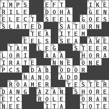 ACROSS 1. Naughty children 5. Lizard (obsolete) 8. Eisenhower's nickname 11. Cause heat under the collar 12. Capital of the state of Qatar 14. Commissioned military rank (abbr.) 15. Choose 17. Sew up the eyelids of hawks and falcons 18. Leaves 19. Scheduled 21. Titan orbits this 23. Afternoon social gathering 25. Detail 26. Snakelike fish 27. Ocean 28. Deep reverence 31. Scottish cap 33. Part of a journey 35. Guide 37. Australian parrot (variant) 38. Auto club (abbr.) 40. Israeli folk dance 41. Feeling or showing extreme anger 43. Compass dir. 45. Single 46. Personal Computers (abbr.) 47. Small moist lump or mass 50. Aroma 52. Billionth: prefix 53. Say or write further 54. Wanderer 56. Next before 61. Mild oath, euphamism for damn 62. Muslim summons to prayer 65. Dinah or Pauly 66. And so on (abbr.) 67. Hero or heavy, e.g. 68. Northwest Algerian city 69. Born 70. Call ___ day 71. Carryall DOWN 1. Angers 2. Place where flour is made 3. Entreaty 4. Religious group 5. Begley and Asner 6. Enemy 7. College paper 8. Composer Stravinsky 9. Peachy ____! 10. Followers of ems 13. Having winglike extensions 16. False hair 18. Chewing product 20. Small valley 22. Afternoon social gatherings 24. At sea 26. Give off 28. Age 29. Past tense of be (plural) 30. Epoch 31. Torque (variant) 32. Caspian sea tributary 34. Separate the seeds from cotton 36. Son of Odin 37. Mouth edge 39. Small Philippine buffalo 42. Dutch treat 44. Whirlpool 48. Approach 49. Tall fast-moving dog breed 51. Lyric poems 52. Tired old horse 54. Pace 55. At one time in the past 57. Opportunity 58. "Corrida" creature 59. Part of Q.E.F. 60. French philosopher Descartes 61. Lair 63. The first octave above the treble staff 64. Teachers' org.