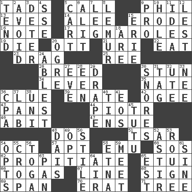 ACROSS 1. Bits 5. Give a ring to 9. Silvers or Donahue 13. Nights before holidays 14. Toward shelter 15. Wear away 16. Musical sound 17. Frustrating wastes of time 19. Expire 20. Baseball player Mel 21. RI univ. 22. Consume 23. To be drawn or hauled along 25. To sift 26. A special lineage 30. Astound 34. Crowbar 35. Nathan's nickname 36. A slight indication 39. Maternal 42. Double curve, resembling the letter S 43. Baking dishes 44. Peter (Polish) 46. "This won't hurt ____!" 47. Follow as a consequence or result 48. Two (Sp.) 51. Russian ruler of old 54. Sep. follower 57. Fitting 58. Australian flightless bird 60. Mayday 62. Conciliate 65. Needle case 66. Ancient Roman robes 67. Actor's bit 68. Attach a signature 69. Connect, as a bridge 70. Part of Q.E.F. 71. Woody plant DOWN 1. Watch over 2. Shun 3. Prevent from occurring 4. Compass dir. 5. Haul 6. Came down and settled, as after flight 7. Part of a journey 8. Arboreal primate 9. Adept person 10. Hollow 11. It may be bright or harebrained 12. For fear that 15. 4th largest of the Great Lakes 18. "We ___ not amused" (Victoria) 20. Legendary monster 24. Most capable 27. First lady 28. Car or cant ending 29. Window treatment 30. Sounds asleep 31. Label 32. Shoshoni 33. Born 36. Numbers guy (abbr.) 37. Experiment locale 38. University (slang) 40. Metal container 41. Greek goddess of the dawn 45. Ballerina skirt 48. Raised platform 49. Choose 50. Vertical member of a panel or frame 52. Being in motion 53. Makeup applied to the cheeks 54. Elects 55. Riding implement 56. Ancient Roman robe 58. Inactive volcano in Sicily 59. Rendezvous 61. Trig term 63. Baking dish 64. Atmosphere 65. Eastern Standard Time (abbr.)