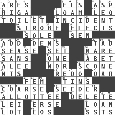 ACROSS 1. Ancient Greek god of war 5. Raised railways 8. Cleo's killer 11. Port city in Latvia 12. Rich soil 13. Lion 14. Bathroom plumbing fixture 17. Event 19. Disco prop 21. Opts 22. Not divided or shared with others 23. Elected rep. 24. Say or write further 27. Hiding places for outlaws 29. Small boy 32. Gospel singer Marvin 34. Put into a specified state 36. Female horse 37. Without 38. Single 39. Collude with 40. Toward shelter 41. Not either 42. Biscuitlike quick bread 43. Mountains (abbr.) 44. Do over again 46. Rowing implement 47. Opposite of masc. 50. Canisters 52. Rough 55. Sowing specialist 57. One to whom something is allotted 59. Erase 62. Flowery wreath 63. Celtic language 64. Grant temporary use of 65. Car dealer's back yard 66. Greek goddess of the dawn 67. Fast planes DOWN 1. Tate display 2. River (Sp.) 3. The front part of a cuirass 4. Table seasonings 5. A really long time 6. Shoestrings 7. Grin 8. Actor Baldwin 9. Emitted 10. Plant holders 12. Untruth 15. Wear away 16. Lacquered or enameled metalware 18. Lair 20. Gillaume's butler role 24. Indian state 25. Started a card game 26. Natives or inhabitants of Denmark 28. Sir (Sp.) 29. Off limits 30. Sports stadium 31. Prevent from occurring 33. Compass dir. 35. Cigar-shaped 36. Big _ 42. Message 45. Passed on 47. From 48. First name in cosmetics 49. Paris' subway 51. Exchanges for money 52. Give a ring to 53. Butter sub 54. Came down and settled, as after flight 55. Perceive with the eye 56. Vintage cars 58. Double-curved letter 60. Make lace 61. Followers of ems