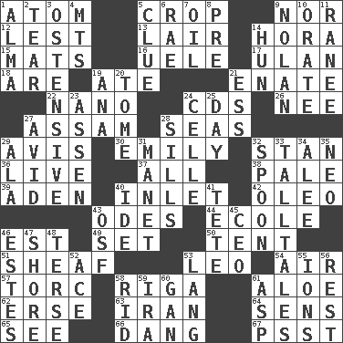ACROSS 1. Tiny particle 5. Riding implement 9. Or not 12. For fear that 13. Den 14. Israeli folk dance 15. Floor coverings 16. Ubangi River tributary 17. ____ Bator, Mongolia 18. "We ___ not amused" (Victoria) 19. Had dinner 21. Related on the mother's side 22. Billionth: prefix 24. Music discs 26. Born 27. Indian state 28. Oceans 29. Deliberation 30. Poet Dickinson 32. Comedian Laurel of Laurel & Hardy 36. Not recorded 37. Everything 38. Diluted with white 39. Arabian gulf 40. An arm off of a larger body of water 42. Butter sub 43. Lyric poems 44. Learning spot: Fr. 46. Eastern Standard Time (abbr.) 49. Arrange properly for use 50. Portable shelter 51. Archer's quiver 53. Lion 54. Atmosphere 57. Torque (variant) 58. Port city in Latvia 61. Medicinal plant 62. Celtic language 63. SW Asia republic 64. Elected reps. 65. Perceive with the eye 66. Mild oath, euphamism for damn 67. Inconspicuous attention getter DOWN 1. _ mater 2. Separate forcefully 3. Clearly or manifestly demonstrative 4. Mountains (abbr.) 5. A slight indication 6. Actress Charlotte 7. Lubricate 8. Before (prefix) 9. Pitcher Ryan 10. Declaim 11. The wife of a rajah (variant) 14. Attila the _ 19. Santa ___, CA 20. Heavy book 21. Double-curved letter 23. NE Netherlands city 24. Cell (Danish) 25. 24 hours 27. Enthusiastic 28. Beverly of Met fame 29. Wing 31. French painter Edouard 32. Soup utensil 33. Baron Munchausen's specialties 34. Toward shelter 35. Modern: prefix 40. Binary compound 41. Wig 43. Order of Saint Francis (abbr.) 45. Corporate head (abbr.) 46. _____ Park, CO 47. Dinah or Pauly 48. Laconic 52. Adept person 53. Austrian-born American filmmaker Fritz 55. Charged particles 56. State of inaction 58. To free from 59. Retirement account (abbr.) 60. Separate the seeds from cotton 61. Cleo's killer