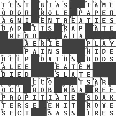 ACROSS 1. Trial 5. Prejudice 9. Not wild 13. Scent 14. Hero or heavy, e.g. 15. Some stationery 16. Hindu god of fire 17. Pleas 19. June honoree 20. It is 21. Hit sharply and swiftly 22. Had dinner 23. Tear apart 25. "One Day ___ Time" 26. Nest on high 30. Shaw product 34. Aches 35. Flintstone garb 36. Assist 39. Profane or obscene expressions 42. Likelihood 43. Toward shelter 44. Ingested 46. Passed on 47. Schedule 48. Environmental prefix 51. Russian ruler of old 54. Sep. follower 57. Director Reiner 58. Basketball assoc. 60. To separate or throw off 62. Appease 65. Neighbor of Neb. 66. Laconic 67. Send forth 68. Be footloose 69. Religious group 70. Backtalk 71. Angers DOWN 1. Frog relative 2. _ Allan Poe 3. Message 4. Three (prefix) 5. Cy Young winner Saberhagen 6. Charged atoms 7. The first octave above the treble staff 8. Father Junipero _ 9. Make lace 10. Capital of Western Samoa 11. Rendezvous 12. Celtic language 15. Dad 18. Ingest 20. The main thing one is thinking about 24. Slept 27. River (Sp.) 28. _ tizzy (2 wds.) 29. _____ Park, CO 30. Gives a jingle 31. Hat (slang) 32. Say or write further 33. It is so 36. Possessed 37. Biblical high priest 38. Area sheltered from the wind 40. Actor Linden 41. R.R. building 45. Singer James 48. One of the Great Lakes 49. Small bed 50. Off-Broadway awards 52. Zeal 53. Break or tear apart 54. Elects 55. Algonquian 56. Torque (variant) 58. Nuclear Threat Initiatives 59. Wagers 61. Supplements with great effort 63. Pacific Standard Time (abbr.) 64. Nursemaid (var.) 65. Indian title of respect (Mr.)