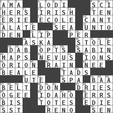 ACROSS 1. Wet nurse (var.) 4. Farming town in central California 8. _-fi 11. Possessive pronoun 13. From or relating to Ireland 15. "___ Little Indians" 16. 4th largest of the Great Lakes 17. Learning spot: Fr. 18. Patter 19. Having winglike extensions 21. Ocean 22. To (old English) 23. Lair 24. Mouth edge 27. For each 29. "____ silly question..." 30. Fur scarf 34. Pat or tap gently 36. Chooses 39. Unit of acoustic absorption 40. Atlas contents 41. Mole, birthmark 43. Charged particles 44. Greek mythologigal hunter 46. Water falling in drops from the sky 47. Born 48. Calif. Air Force Base 49. Bits 51. Shoshoni 53. Health resort 54. Sound made by sheep 57. Waist strap 60. Spanish title 63. Frees from moisture 65. Double curve, resembling the letter S 66. Potato state 69. Blunders 70. Again 71. Lugs 72. Singer Brickell 73. Fast jet (abbr.) 74. Former U.S. Attorney General Janet 75. Elected rep. DOWN 1. At or in the front 2. Haggard of country music 3. Believer in; advocate of (suffix) 4. Falsehood 5. The grampus (Milton) 6. "Vaya con ____" 7. Capri or Wight 8. Comedian Laurel of Laurel & Hardy 9. Penny 10. To the inside or interior of 12. Arrange properly for use 14. Pile 18. Window treatments 20. Raised railways 25. Visual representation of an object 26. Some stationery 28. Double-curved letter 29. Utter; complete 31. Mitch Miller's instrument 32. Actor's bit 33. Followers of ems 34. Have the gumption 35. Capital of Western Samoa 37. Federal power corp. 38. Sets or collections 40. Crowd into 42. Fastener 45. Fish or hair follower 50. Male parent 52. Prepare for publication 54. Avian creatures 55. Nest on high 56. NE Netherlands city 57. Moves up and down 58. Armor plate that protects the chest 59. For fear that 61. Scent 62. Nathan's nickname 64. To separate or throw off 67. Layer 68. Bear (Spanish)