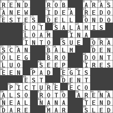 ACROSS 1. Tear apart 5. Director Reiner 8. Caspian sea tributary 12. Afresh 13. The main thing one is thinking about 15. Redecorate 16. _____ Park, CO 18. Small valley 19. Southwest Nigerian state 20. Car dealer's back yard 22. Deli grouping 24. Rich soil 26. _ tizzy (2 wds.) 27. To the inside or interior of 28. Institute legal proceedings 29. Mouth or opening 32. Skim 35. Lip ointment 37. Lair 38. Cassini of fashion 39. Sis' sibling 40. Do not 41. Nilotic language 42. Ooze 43. Angers 44. Car or cant ending 45. Groovy apt. 46. Armor plate that protects the chest 49. Eastern Standard Time (abbr.) 50. Incision 51. Photo 55. Environmental prefix 56. In addition 57. Printing process, for short 59. Sports stadium 63. Actress Patricia 64. Grandmother 65. Be inclined (to) 66. Have the gumption 67. Spoil 68. Downhill vehicle DOWN 1. Actress Charlotte 2. Followers of ems 3. Fish or hair follower 4. Residence 5. To free from 6. Lyric poems 7. Actor Lugosi 8. Odor 9. Painter Guido (1575-1642) 10. Does sums 11. "Barney Miller" actor Jack 14. Plant genus of onion and garlic 17. Within a short period 21. Make lace 23. One (Scot) 25. Crowded into 28. Inclined 29. Scent 30. French philosopher Descartes 31. Pismires 32. Flatfish 33. A slight indication 34. Period of immesurable duration 36. "We ___ not amused" (Victoria) 40. What propaganda does 42. Titan orbits this 45. Pacific Standard Time (abbr.) 47. Unit of force equal to gravity 48. South American Indian 49. Learning spot: Fr. 51. Entreaty 52. Austrian river, tributary to the Danube 53. Wander aimlessly 54. Inactive volcano in Sicily 56. Plus 58. Rowing implement 60. Snakelike fish 61. Compass dir. 62. Say or write further