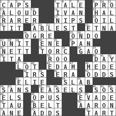 ACROSS 1. Smile enhancers 5. Falsehood 9. Adept person 12. Verbally 14. "Terrible" tsar 15. Actor Linden 16. More uncommon 17. Cuts off 18. Lubricate 19. Teat (slang) 20. Most capable 23. Inactive volcano in Sicily 24. Legendary monster 25. Southwest Nigerian state 27. A single undivided whole 30. Compass dir. 32. Baking dish 33. Remaining after all deductions 34. Torque (variant) 36. E Mali city 38. Call ___ day 39. Friend of Pooh 40. 24 hours 43. Car dealer's back yard 46. Dutch treat 48. Ancient Persian 49. Big collection agency 51. Period 52. Likelihood 53. Writer Wiesel 54. Thick slice 56. Without 58. Artist's stands 61. Mayday 64. Raised railways 65. Musical composition 66. Elude 68. The 19th letter of the Greek alphabet 69. Waist strap 70. Composer Copland 71. One (Scot) 72. Sums up 73. Small pie DOWN 1. Haul 2. Jai _ 3. Left side of a ship or aircraft 4. Institute legal proceedings 5. Prong on a fork 6. Deliberation 7. Portable computer 8. Followers of ems 9. Picture 10. Water falling in drops from the sky 11. Water jar 13. To draw with force 21. Cy Young winner Saberhagen 22. Poe poem 23. Pulitzer Prize-winning author Ferber 24. Baseball player Mel 26. Tired old horse 27. University (slang) 28. Fish or hair follower 29. Slanted text style (abbr.) 31. Wear away 35. Rough 37. Wrote a lyric poem 41. Increase 42. Affirmative reply 44. Petroleums 45. Three (prefix) 47. Shopping center 48. Crowd into 50. Oozed 53. Follow as a consequence or result 55. Toward the sea 56. Bristle 57. Actor Alda or Thicke 59. Old (Scot.) 60. Fast planes 61. "Two Mules for Sister ____" 62. Scent 63. Transmitted 65. Chief or king in Benin or Nigeria 67. Large container