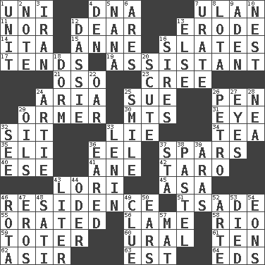 ACROSS 1. Single; one (prefix) 4. Heredity factor (abbr.) 7. ____ Bator, Mongolia 11. Or not 12. Letter starter 13. Wear away 14. Call ___ day 15. Queen of England 1702-14 16. Chalkboards 17. Is inclined (to) 19. Aide 21. Bear (Spanish) 23. Algonquian 24. Roberta Peters solo 25. Institute legal proceedings 26. Animal enclosure 29. Channel Islands abalone 30. Mountains (abbr.) 31. Sight organ 32. Be seated 33. Untruth 34. Beverage made from leaves 35. Biblical high priest 36. Snakelike fish 37. Practice fights 40. Compass dir. 41. A saturated hydrocarbon 42. Pacific island yam 43. Australian parrot (variant) 45. White ___ sheet 46. Home 51. Sadhe (variant) 55. Spoke pompously 56. Unable to walk 58. River (Sp.) 59. Carrier 60. Mountain range 61. Nine, plus one 62. SW Saudi Arabia district 63. Eastern Standard Time (abbr.) 64. Begley and Asner DOWN 1. A single undivided whole 2. Brief written record 3. SW Asia republic 4. Lair 5. Grandmother 6. Ancient Greek god of war 7. A salt of uric acid 8. Globular water bottle used in Asia 9. Arabian gulf 10. A home for chicks 12. Hyrax 13. Otherwise 16. Titles for men of rank and authority 18. Dormintory (informal) 20. Snake scale 22. Boat paddle 24. Nick name for Arthur 25. Grin 26. Stone: prefix 27. Sight organs 28. Teachers' org. 29. Petroleums 32. Perceive with the eye 33. Soviet premier 1918-24 36. Having ears or earlike features 37. R.R. building 38. Soft color 39. Ancient river in northeast Turkey 43. 61 cubic inches 44. River in Europe 46. Round or rotation of duties 47. Greek god of love 48. Suttee (variant) 49. A slight indication 50. Hearing organs 52. Johnson of "Laugh-In" 53. Passed on 54. Immeasurably long periods of time 57. Floor protector