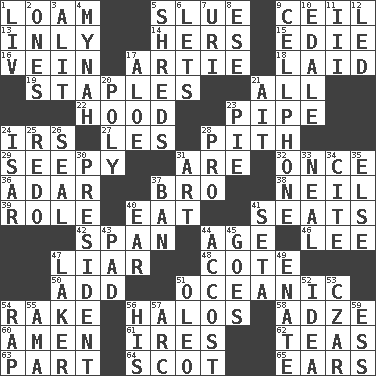 ACROSS 1. Rich soil 5. Change direction abruptly 9. To provide with a ceiling 13. In an inward manner 14. Possessive pronoun 15. Singer Brickell 16. Distinctive style or manner 17. Nick name for Arthur 18. Put down 19. Paper fasteners 21. 100% 22. Parka part 23. Corncob 24. Big collection agency 27. French article 28. Heart or essence 29. Not well drained, as in land 31. "We ___ not amused" (Victoria) 32. At one time in the past 36. The sixth month of the Jewish calendar 37. Sis' sibling 38. Famous astronaut Armstrong 39. Hero or heavy, e.g. 40. Erode 41. Theater features 42. Connect, as a bridge 44. Grow older 46. Area sheltered from the wind 47. One who doesn't tell the truth 48. ____ d'Azur (French Riviera) 50. Say or write further 51. Pertaining to the sea 54. Libertine 56. Saint headwear 58. Axlike tool, used for shaping wood 60. So be it 61. Angers 62. Afternoon social gatherings 63. Role in a play 64. Native of Scotland 65. Hearing organs DOWN 1. 54 in ancient Rome 2. Singles 3. Set down 4. Non-adult bird? 5. Tears up 6. Allows 7. RI univ. 8. Compass dir. 9. Portable communications device 10. Peak District village in England 11. One more than two 12. Directed 17. _ vera 20. More than one (prefix) 21. Small island 23. Sliced dessert 24. Austrian river, tributary to the Danube 25. Redecorate 26. Lick closed 28. Adept person 30. Elected leader of a country 31. Tate display 33. Anneal 34. Quote 35. Otherwise 37. Prohibit 40. Hearing organ 41. Stalk of a moss capsule 43. Groovy apt. 44. Buttonhole 45. Travels 47. Member of a famous L.A. basketball team 49. Related on the mother's side 51. Margarine 52. The content of cognition 53. Russian ruler of old 54. Reproach for some lapse or misdeed 55. Nursemaid (var.) 56. Part of HMS, perhaps 57. Curve 59. Curvy letter