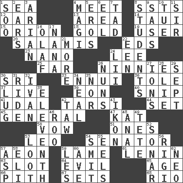 ACROSS 1. Ocean 4. Confront 8. Fast planes 12. Boat paddle 13. Length times width 14. "Change" in Tahitian 15. Constellation of myth 18. Gilt 19. One who uses or employs something 20. Deli grouping 22. Begley and Asner 23. Billionth: prefix 24. Area sheltered from the wind 25. At a great distance 26. Simpletons 30. Indian title of respect (Mr.) 33. World-weariness 36. Lacquered or enameled metalware 37. Moving, as bait 39. Period of immesurable duration 40. Clip 41. Allodial 42. Tarsus (plural) 44. Put into a specified state 45. Commissioned military rank 47. Krazy ___ of comics 50. Solemn pledge 51. Singles 53. Lion 54. Elected representative 57. Age 59. Unable to walk 61. Soviet premier 1918-24 63. Groove 64. Morally bad or wrong 65. Mature 66. Essential or central part 67. Puts into a specified state 68. _ de Janeiro DOWN 1. "Barney Miller" actor Jack 2. Hearing organs 3. Believer in; advocate of (suffix) 4. Wise men 5. Greek god of love 6. Snakelike fish 7. Small boy 8. SAT takers 9. Backtalk 10. Third day of the wk. 11. Title for a knight 16. Norwegian king 17. Grandmother 21. Greater amount 22. Car or cant ending 24. Cards in a Roman deck? 26. Religious women 27. Charged particles 28. Writer Wiesel 29. Back-to-school mo. 30. A hard, heavy blow 31. Travel on or in a vehicle 32. "Terrible" tsar 34. Anneal 35. And not 38. Veterans Day date 42. The 23rd letter of the Hebrew alphabet 43. Image 46. Friend of Pooh 48. Of or related to the anus 49. Wig 52. Echolocation 53. Spoils 54. Stricken, poetically 55. Snakelike fish 56. Swiss mountan, "Queen of the Mountains" 57. Cleo's killer 58. Connecticut Ivy Leaguer 59. French article 60. "___ Maria" 62. Modern: prefix