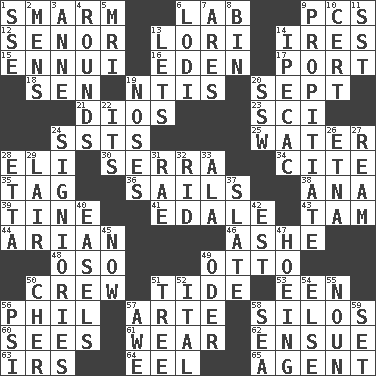 ACROSS 1. Excessive but superficial compliments 6. Experiment locale 9. Personal Computers (abbr.) 12. Sir (Sp.) 13. Australian parrot (variant) 14. Angers 15. World-weariness 16. Genesis locale 17. Left side of a ship or aircraft 18. Elected rep. 19. Nuclear Threat Initiatives 20. Back-to-school mo. 21. "Vaya con ____" 23. _-fi 24. Fast planes 25. Wetness 28. Connecticut Ivy Leaguer 30. Father Junipero _ 34. Quote 35. Label 36. Travel by water 38. Santa ___, CA 39. Prong on a fork 41. Peak District village in England 43. Scottish cap 44. Believer in; advocate of (suffix) 46. American tennis player Robert 48. Bear (Spanish) 49. Von Bismarck 50. Group working together 51. Periodic rise and fall of the sea level 53. Car or cant ending 56. Silvers or Donahue 57. Johnson of "Laugh-In" 58. Grain storage towers 60. Perceives with the eye 61. Put on (as clothing) 62. Follow as a consequence or result 63. Big collection agency 64. Snakelike fish 65. Rep DOWN 1. Compass dir. 2. Not women's 3. Singer Murray 4. Periods in a boxing match 5. Medical imaging device (abbr.) 6. Farming town in central California 7. Ancient Greek god of war 8. Storage container 9. Appease 10. Sure thing 11. Fast jet (abbr.) 13. Allows 14. Medicinal drug used to evoke vomiting 19. Olfactory organs 20. Compass dir. 22. It is 24. Seigniories (variant) 26. Inactive volcano in Sicily 27. 480, 500 or 516 sheets of paper 28. Singer James 29. Den 31. Actress Charlotte 32. To free from 33. Wing 37. Schedule 40. Artist's stands 42. Eastern Standard Time (abbr.) 45. At this time 47. Weeding 49. River in Europe 50. "Mermaids" star 51. Woody plant 52. Slanted text style (abbr.) 54. Otherwise 55. Part of speech 56. Air pressure measure (abbr.) 57. Deep reverence 58. Ocean 59. Put into a specified state