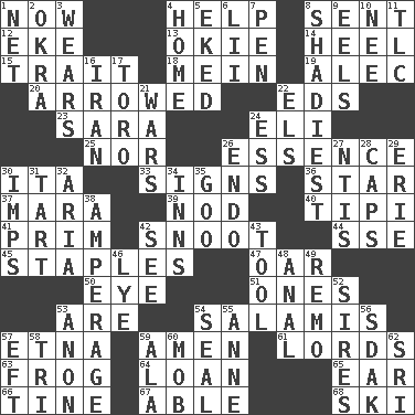 ACROSS 1. At this time 4. Aid 8. Emitted 12. Make supply last 13. Migrant worker of the '30s 14. The bottom of a shoe or boot 15. Distinguishing feature 18. Count _ (2 wds.) 19. Actor Baldwin 20. Moved like an arrow 22. Begley and Asner 23. "Two Mules for Sister ____" 24. Connecticut Ivy Leaguer 25. And not 26. Substance 30. Call ___ day 33. Signals 36. Play the lead 37. Hindu Mythology: god of death 39. Allow head to fall sleepily 40. Native american tent (variation) 41. Demure 42. Snout, nose 44. Compass dir. 45. Paper fasteners 47. Rowing implement 50. Sight organ 51. Singles 53. "We ___ not amused" (Victoria) 54. Deli grouping 57. Inactive volcano in Sicily 59. So be it 61. Domineers 63. Tree-dwelling hopper 64. Grant temporary use of 65. Hearing organ 66. Prong on a fork 67. Competent 68. What Jean-Claude Killy likes to do DOWN 1. Fish or hair follower 2. Gumbo ingredient 3. Erodes 4. Dwelling 5. Made supply last 6. Cards in a Roman deck? 7. Writing instrument 8. Most dark, concealed or hidden 9. Snakelike fish 10. Born 11. Affectionate concern, for short 16. SW Asia republic 17. "Corrida" creature 21. Armed conflicts 22. Raised railways 24. Curvy letter 26. Inside; within (prefix) 27. Nuclear Threat Initiatives 28. Smile enhancers 29. One of the Great Lakes 30. Naughty children 31. Small pie 32. Operatic vocal solo 34. Lodging establishments 35. Thick or sticky substance 38. Electrical Measurement 42. Perceive with the eye 43. Utensil 46. Sodium hydroxide 48. Of or related to the anus 49. San ____ (Riviera town) 52. Fathers 53. Soon (poet.) 54. Lick closed 55. Singer Murray 56. Neighbor of Neb. 57. Newt 58. Three (prefix) 59. In the manner of 60. Disorderly crowd 62. _ Lanka