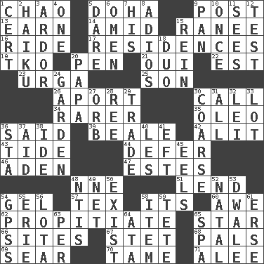 ACROSS 1. US Secretary of Labor Elaine L. _ 5. Capital of the state of Qatar 9. Mail 13. Merit 14. Among 15. The wife of a rajah (variant) 16. Travel on or in a vehicle 17. Dwellings 19. Ring climax 20. Animal enclosure 21. Fr. "Yes" 22. Eastern Standard Time (abbr.) 23. Capital and largest city of Mongolia 25. Male offspring 26. To the left, to Queeg 30. Give a ring to 34. More valued for its uncommonness 35. Margarine 36. Alleged 39. Calif. Air Force Base 42. Set down 43. Event that recurs at intervals 44. Put off 46. Arabian gulf 47. _____ Park, CO 48. Compass dir. 51. Grant temporary use of 54. Set 57. John Ritter's dad 58. It is 60. Deep reverence 62. Appease 65. Play the lead 66. Locates 67. Proofreading order 68. Friends 69. Wither 70. Not wild 71. Toward shelter DOWN 1. An absolute certainty 2. Japanese poetic form 3. Zeal 4. Single 5. Have the gumption 6. Sign of something about to happen 7. Part of HMS, perhaps 8. Goodbye (Sp.) 9. Baking dish 10. At one time in the past 11. Perceives with the eye 12. Trial 15. It's straight from the horse's mouth 18. Superhero pair 20. Dad 24. Place where plants grow 27. Globe 28. To separate or throw off 29. Barter 30. Rough 31. Everything 32. Luau accessory 33. Car dealer's back yard 36. R.R. building 37. Assist 38. Binary compound 40. French article 41. Lizard (obsolete) 45. Snakelike fish 48. Nuclear Threat Initiatives 49. Fish or hair follower 50. Be 52. Brizilian seaport 53. A sleeping potion; an opiate (poet.) 54. Global Positioning Systems (abbr.) 55. 4th largest of the Great Lakes 56. Globular water bottle used in Asia 58. Detail 59. False hair 61. Celtic language 63. For each 64. "One Day ___ Time" 65. Health resort
