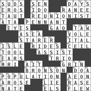 ACROSS 1. Soap bubbles 5. Elected rep. 8. 24-hour periods 12. Greek god of love 13. Wedding promise 14. Indian princess (variant) 15. Tense 16. One who advocates reunion 19. "One Day ___ Time" 20. Pre-World Series prize 21. Snake ____ (dice throw) 23. E Mali city 24. The 23rd letter of the Hebrew alphabet 27. At sea 30. Grand slam 31. A viewer who gazes fixedly 34. Slanted text style (abbr.) 35. Capri or Wight 38. Amusement-park features 40. To provide with a ceiling 41. Utensil 42. Help 44. Hearing organs 45. Musical group of three 46. Medical imaging device (abbr.) 47. Small island 50. Broad smile 53. "Death Wish" actor 57. ___ good deed 59. Census information 63. Age 64. Came up 65. Untruth 66. Raze (variant) 67. Nathan's nickname 68. Raised railways 69. Soared DOWN 1. Bristle 2. A salt of uric acid 3. A city in N France, SE of Calais 4. Fast jet (abbr.) 5. The founder of a family 6. Locale of original sin 7. Part of speech 8. One of the 12 tribes of Israel 9. Black tropical American cuckoo 10. Consenting reply 11. Arrange properly for use 14. Printing process, for short 17. Tired old horse 18. _ tizzy (2 wds.) 20. Inconspicuous attention getter 22. Artist's stands 24. Carryall 25. Jai _ 26. Water source 28. Ewer handle 29. Operatic vocal solo 30. Winning man's name 32. Begley and Asner 33. Relief 35. Detail 36. Fly high 37. Australian parrot (variant) 39. Title for a knight 43. Omen 47. Competent 48. Retirement account (abbr.) 49. Small child 51. Standard of perfection 52. Trap for birds or small mammals 54. Mediterranean tributary 55. Land 56. Singles 58. Afresh 59. Baking dish 60. Mouth or opening 61. Cooking vessel 62. Purpose 63. Sandy's bark
