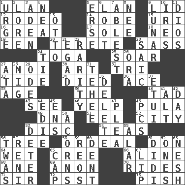 ACROSS 1. Uhlan (variant) 5. Flair 9. Hat (slang) 12. Cowboy competition 14. Loose flowing garment 15. RI univ. 16. Relatively large 17. Not divided or shared with others 18. Modern: prefix 19. Car or cant ending 20. Cylindrical with tapered ends 23. Backtalk 24. Ancient Roman robe 25. Fly high 27. Mine, in Marseilles 30. Tate display 32. Three (prefix) 33. Event that recurs at intervals 34. Passed on 36. Adept person 38. Mature 39. Definite Article 40. Bit 43. Perceive with the eye 46. Sharp bark 48. Monetary unit of Botswana 49. Heredity factor (abbr.) 51. Snakelike fish 52. Municipality 53. Compact _ 54. Beverages made from leaves 56. Family _ (genealogy) 58. Severe or trying experience 61. Spanish title 64. Dripping 65. Algonquian 66. Place in a line 68. One (Scot) 69. Soon (poet.) 70. Amusement-park features 71. Title for a knight 72. Inconspicuous attention getter 73. Expression of disdain DOWN 1. Goad 2. Old wives' tales, e.g. 3. An important port of Yemen 4. Teachers' org. 5. Celtic language 6. Spoils 7. Most capable 8. Born 9. Type of eclipse 10. Angers 11. "Vaya con ____" 13. Von Bismarck 21. Mild oath 22. Noteworthy scarcity 23. Ketch in the Levant 24. Make a knot 26. Mouth or opening 27. "One Day ___ Time" 28. Russian fighter aircraft 29. Lyric poems 31. Giggle 35. Erase 37. Needle holder 41. The first octave above the treble staff 42. 24 hours 44. Singer Brickell 45. Followers of ems 47. Entreaty 48. Personal Computers (abbr.) 50. Oak nuts 53. Prevent from occurring 55. Having or resembling wings 56. It was, poetically 57. Painter Guido (1575-1642) 59. Vintage cars 60. Gouge 61. "You Light Up My Life" star Conn 62. Washington bills 63. Soft 65. Head covering 67. Mouth edge