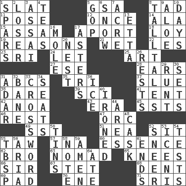 ACROSS 1. Narrow board 5. Girls' org. (abbr.) 8. Small boy 11. Introduce or present, as a question 12. At one time in the past 14. According to 15. Indian state 17. To the left, to Queeg 18. Myrna of the movies 19. Thinks logically 21. Dripping 22. French article 23. Indian title of respect (Mr.) 24. Allow 25. Nonscientific branch of learning 27. Compass dir. 28. Hearing organs 31. Lettered men learn these first 35. Three (prefix) 37. Change direction abruptly 38. Have the gumption 39. _-fi 41. Portable shelter 42. Small Philippine buffalo 43. Period 45. Fast planes 46. Respite 47. The grampus (Milton) 49. Fast jet (abbr.) 51. Teachers' org. 52. Be seated 55. The 23rd letter of the Hebrew alphabet 57. _ tizzy (2 wds.) 60. Substance 62. Sis' sibling 63. Roamer 65. Leg joints 66. Title for a knight 67. Proofreading order 68. Scratch 69. Groovy apt. 70. Compass dir. 71. Indian titles of respect DOWN 1. Practice fights 2. Failure 3. Slender Brazilian palm 4. Beverages made from leaves 5. Republican Party 6. Frozen precipitation 7. 43,560 square feet 8. Baron Munchausen's specialties 9. Medicinal plant 10. 24-hour periods 13. Singer James 16. Undercover agent 17. Michaelmas daisies 20. A home for chicks 26. Musical pauses 29. The smallest animal of a litter 30. Puts into a specified state 31. The sixth month of the Jewish calendar 32. Object of repulsion 33. What you're doing now 34. Theater features 36. Frozen water 40. Pressed 44. Ancient Greek god of war 48. Keg 50. Canisters 52. Scornful expression 53. Ancient Celtic tribe of eastern Britain 54. Trials 55. Cook's measure (abbr.) 56. Roberta Peters solo 58. Brief written record 59. So be it 61. Extremities 64. Had dinner