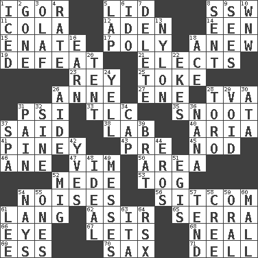 ACROSS 1. Composer Stravinsky 5. Hat (slang) 8. Compass dir. 11. Root beer relative 12. An important port of Yemen 14. Car or cant ending 15. Maternal 17. Many (prefix) 18. Afresh 19. Outscore 21. Chooses 23. Marina Del _, California 25. Puff or smoke 26. Singer Murray 27. Compass dir. 28. Federal power corp. 31. 23rd letter of the Greek alphabet 33. Affectionate concern, for short 35. Snob 37. Alleged 38. Experiment locale 40. Roberta Peters solo 41. Abounding in pines 43. Before (prefix) 45. Allow head to fall sleepily 46. One (Scot) 47. Zeal 50. Type of rug 52. Ancient Persian 53. Coat; cloak 54. Annoying sounds 56. "Cheers" or "Ellen" 61. Long (Scottish) 62. SW Saudi Arabia district 65. Spanish missionary in California 66. Sight organ 67. Allows 68. Be tempered by heat 69. Curvy letter 70. Saxophone 71. Small valley DOWN 1. On the rocks 2. Went 3. Norwegian king 4. Assign a rank or rating to 5. Infant locale 6. Wedding promise 7. Keyboard key 8. Transmitted 9. Perceives with the eye 10. Compass dir. 13. Thermoplastic polyamide 16. Merit 18. Adept person 20. Portable shelter 22. Makes supply last 24. Shout 26. Helper 28. "Corrida" creature 29. Nothingness 30. "One Day ___ Time" 31. Ache 32. Trig term 34. Head covering 36. Nanny 37. Health resort 39. Naughty child 42. Jacques Cousteau's middle name 44. Greek god of love 48. Perfect 49. Makes clutter 51. Armor plate that protects the chest 52. Russian fighter aircraft 54. Negative votes 55. Washington bills 57. Look after 58. Algonquian 59. Spoken 60. Shopping center 61. Area sheltered from the wind 63. Call ___ day 64. Acura sports coupe