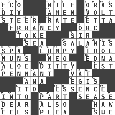 ACROSS 1. Environmental prefix 4. "Death on the ____" 8. Mouths or openings 12. HTML Container Element 13. So be it 14. Electrical Unit 15. Guide 18. Pace 19. Singer James 20. The state or an instance of erring 22. The grampus (Milton) 23. Casino tip 24. Title for a knight 25. Ocean 26. Deli grouping 30. Health resort 33. Containing lumps 36. Instrument 37. Religious women 39. Modern: prefix 40. Pulitzer Prize-winning author Ferber 41. _ vera 42. Short, simple song 44. Eastern Standard Time (abbr.) 45. Pre-World Series prize 47. Large container 50. Santa ___, CA 51. Armor plate that protects the chest 53. It would 54. Gist 57. To the inside or interior of 59. Role in a play 61. Gospel singer Marvin 63. Letter starter 64. In addition 65. Informal term for the mouth 66. Snakelike fish 67. Entreaty 68. Take to court DOWN 1. Begley and Asner 2. Quote 3. Unconcealed 4. Drug cop 5. "If ____ say so..." 6. Allow 7. Compass dir. 8. Make much ado about nothing 9. College mil. group 10. The first octave above the treble staff 11. R.R. building 16. Greek god of love 17. Immoral or dissolute person 21. Be tempered by heat 22. Lubricate 24. Declare 26. Specific locale 27. Method 28. Charged atoms 29. Narrow board 30. Fastener 31. Whine 32. Soon (poet.) 34. A single undivided whole 35. Was introduced to 38. Legislators 42. Heredity factor (abbr.) 43. Jacques Cousteau's middle name 46. Plus 48. Eons 49. Prong on a fork 52. Fraudulent business schemes 53. Slanted text style (abbr.) 54. Celtic language 55. Portico 56. Son of Isaac 57. Binary compound 58. Born 59. Infant food 60. Everything 62. She-sheep