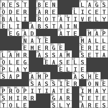 ACROSS 1. Remainder 5. Benjamin's nick name 8. Straggles 12. Baltic tributary 13. "We ___ not amused" (Victoria) 14. It is permitted: Lat. 15. Indonesian resort city 16. Producing rotation 19. Biblical high priest 20. Choose not to consume 21. Mild oath 23. Had dinner 24. Atlas unit 27. Nathan's nickname 30. Promenade 31. Develop 34. One of the Great Lakes 35. Cowardly lion portrayer 38. Indian state 40. Stalk of a moss capsule 41. Cassini of fashion 42. Artist's stands 44. Frolic 45. Writer Wiesel 46. Plant excrement 47. Electrical Unit 50. American tennis player Robert 53. More disrespectful 57. Single 59. Conciliate 63. "If ____ say so..." 64. Bake eggs in their shells 65. Slender fish 66. Wig 67. Lacquered or enameled metalware 68. Insidious 69. Ancient Greek god of war DOWN 1. Loose flowing garment 2. Peak District village in England 3. Major League Baseball Commissioner Bud 4. Three (prefix) 5. Sharp remark 6. Greek god of love 7. Remaining after all deductions 8. 54 in ancient Rome 9. Adept person 10. Set 11. Filthy place 14. Actor's bit 17. American Automobile Association (abbr.) 18. Teat (slang) 20. First of billions? 22. Disorder of the immune system 24. Female horse 25. Came down and settled, as after flight 26. Entreaty 28. Beverage made from leaves 29. Celtic language 30. Makes clutter 32. Girls' org. (abbr.) 33. Relaxation 35. Chops off 36. Silent film actress Nazimova 37. Pile 39. Cartoonist voice _ Blanc 43. One who doesn't tell the truth 47. SW Saudi Arabia district 48. Floor protector 49. Air pressure measure (abbr.) 51. Home run 52. Related on the mother's side 54. Droops 55. Slanted text style (abbr.) 56. Suggestive of the supernatural 58. Sight organs 59. Pacific Standard Time (abbr.) 60. 17th letter of the Greek alphabet 61. Petroleum 62. Before (prefix) 63. Call ___ day