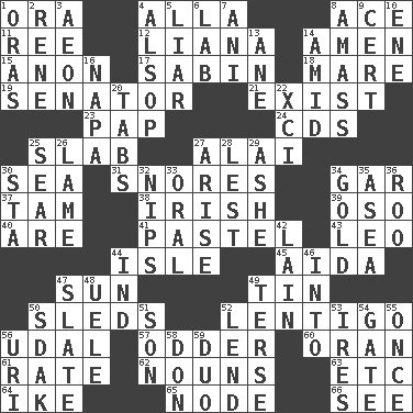 ACROSS 1. Mouth or opening 4. Silent film actress Nazimova 8. Adept person 11. To riddle 12. Woody, climbing, usually tropical plant 14. So be it 15. At once, immediately (arch.) 17. Unit of acoustic absorption 18. Female horse 19. Elected representative 21. Be extant 23. Infant food 24. Music discs 25. Broad, flat, thick piece 27. Jai _ 30. Ocean 31. Sounds asleep 34. Slender fish 37. Scottish cap 38. From or relating to Ireland 39. Bear (Spanish) 40. "We ___ not amused" (Victoria) 41. Soft color 43. Lion 44. Small island 45. Opera by Verdi 47. Player for Phoenix 49. Shallow baking pan 50. Bobsleighs 52. Small, flat, pigmented spot on the skin 56. Hereditary estate 57. More peculiar 60. Northwest Algerian city 61. Pace 62. Parts of speech 63. And so on (abbr.) 64. Mamie's husband 65. Connecting point 66. Observe DOWN 1. Mouths or openings 2. French philosopher Descartes 3. A really long time 4. Columnist Joseph or Stewart 5. One who doesn't tell the truth 6. Experiment locale 7. Black tropical American cuckoo 8. Collect or gather 9. An absolute certainty 10. Compass dir. 13. One (Scot) 14. Among 16. California wine valley 20. Bar bills 22. One more than ninety 25. Shrivel 26. Unable to walk 27. Get up 28. For fear that 29. American tennis player Robert 30. R.R. building 32. Cuts off 33. Taken by mouth 34. Gilded 35. Toward the sea 36. Friend of Pooh 42. (Had) reclined 44. Indiana (abbr.) 46. To the inside or interior of 47. Chalkboard 48. Ubangi River tributary 49. Laconic 50. Neighbor of Neb. 51. Male child 52. Grant temporary use of 53. Angers 54. Yard entry 55. Single time 56. RI univ. 58. Spanish title 59. Superhero pair