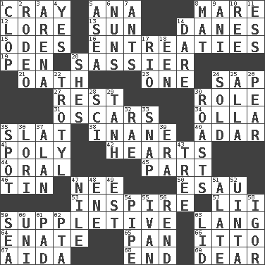 ACROSS 1. Supercomputer manufacturer 5. Santa ___, CA 8. Female horse 12. Old wives' tales, e.g. 13. Player for Phoenix 14. Natives or inhabitants of Denmark 15. Lyric poems 16. Pleas 19. Writing instrument 20. More lively and spirited 21. Pledge 23. Single 24. Plant excrement 27. Repose 30. Hero or heavy, e.g. 31. Motion picture awards 34. Spanish pot 35. Narrow board 38. Empty; void 40. The sixth month of the Jewish calendar 41. Much (prefix) 42. Centers of feelings and intuitions 44. Spoken 45. Component 46. Metal container 47. Born 50. He sold his birthright 53. Motivate 57. Cards in a Roman deck? 59. Supplying deficiencies 63. Long (Scottish) 64. Related on the mother's side 65. Baking dish 66. "Tell ____ the Marines!" 67. Opera by Verdi 68. Conclusion 69. Letter starter DOWN 1. Hoof sound 2. Cowboy competition 3. Sports stadium 4. Consenting reply 5. Toward the sea 6. Religious women 7. Pismires 8. Floor covering 9. Black tropical American cuckoo 10. To sift 11. Double-curved letter 14. Have the gumption 17. _ de Janeiro 18. Car or cant ending 20. "______ My Girl" (Turtles hit) 22. TNT 24. Exchanged or delivered for money 25. Silent film actress Nazimova 26. Lightbulb-shaped fruit 28. _-fi 29. Hyperbolic tangent 30. Exposes to great heat 32. Actress Charlotte 33. Fastener 35. Specific locale 36. Australian parrot (variant) 37. Actor Alda or Thicke 39. Period 43. Woody plant 47. Mediterranean tributary 48. Compass dir. 49. Eastern Standard Time (abbr.) 51. Having winglike extensions 52. National forest in Provo, Utah 54. Corncob 55. _ the terrible 56. Tear apart 58. Russian composer Stravinsky 59. Ocean 60. University (slang) 61. Writing tablet 62. Parent Teacher Assoc. 63. Hat (slang)