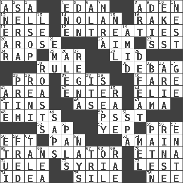 ACROSS 1. White ___ sheet 4. Dutch treat 8. An important port of Yemen 12. 1994 drama film starring Jodie Foster 14. Pitcher Ryan 16. Libertine 17. Celtic language 18. Pleas 20. Came up 22. Direct toward a target or goal 23. Fast jet (abbr.) 24. Reproach for some lapse or misdeed 25. Third mo. 28. Flaplike covering 30. Governing power 31. Debunk (Brit. slang) 35. Adept person 37. Armor plate that protects the chest 40. Conductor's collection 41. Type of rug 42. Keyboard key 44. Writer Wiesel 45. Airtight sealed metal containers 46. Toward the sea 47. Nanny (var.) 48. Gives off 50. Inconspicuous attention getter 52. Plant excrement 54. Slangy assent 55. Before (prefix) 58. Lizard (obsolete) 61. Baking dish 63. At full speed 65. Interpreter 70. Inactive volcano in Sicily 71. Ubangi River tributary 72. Damascus' land 73. For fear that 74. It may be bright or harebrained 75. Filth; sediment 76. Born DOWN 1. Approach 2. Spanish missionary in California 3. Columnist Joseph or Stewart 4. Compass dir. 5. Spanish title 6. The first octave above the treble staff 7. Hindu Mythology: god of death 8. Nonscientific branch of learning 9. Raised platform 10. Makes supply last 11. A home for chicks 13. French article 15. Famous astronaut Armstrong 19. Among 21. Australian flightless bird 26. Toward shelter 27. Rain (Swedish) 29. Outscore 30. Exposes to great heat 32. Lip ointment 33. Roberta Peters solo 34. Unit of force equal to gravity 35. Demure 36. Painter Guido (1575-1642) 38. It is 39. Not well drained, as in land 41. Had dinner 43. To erase 49. Plant excrements 51. Health resort 53. Friends 55. Eucharist need 56. Remove soap 57. Related on the mother's side 58. Needle holder 59. Flintstone 60. Falsehood 62. Negative votes 64. Cartoonist voice _ Blanc 66. Teachers' org. 67. Three (prefix) 68. Lubricate 69. Actress Charlotte
