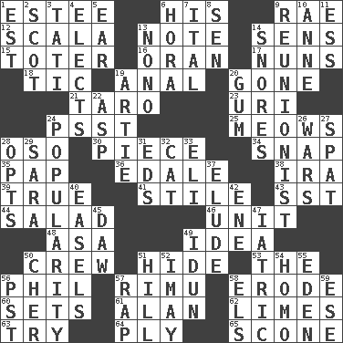 ACROSS 1. First name in cosmetics 6. Part of HMS, perhaps 9. Actress Charlotte 12. Any of the three canals of the cochlea 13. Observe 14. Elected reps. 15. Carrier 16. Northwest Algerian city 17. Religious women 18. Nervous spasm 19. Of or related to the anus 20. Went 21. Pacific island yam 23. RI univ. 24. Inconspicuous attention getter 25. Catcalls? 28. Bear (Spanish) 30. Component 34. Fastener 35. Infant food 36. Peak District village in England 38. Retirement account (abbr.) 39. Loyal 41. Vertical member of a panel or frame 43. Fast jet (abbr.) 44. Vegetable dish 46. A single undivided whole 48. White ___ sheet 49. It may be bright or harebrained 50. Ship's personnel 51. Flintstone garb 53. Definite Article 56. Silvers or Donahue 57. Tall New Zealand timber tree 58. Eat (away) 60. Arranges properly for use 61. Actor Alda or Thicke 62. Citrus fruits 63. Attempt 64. Travel a route regularly 65. Biscuitlike quick bread DOWN 1. Eastern Standard Time (abbr.) 2. Highlander 3. Jacques of French films 4. Opts 5. Hearing organ 6. Israeli folk dance 7. Slanted text style (abbr.) 8. Elected rep. 9. One who advocates reunion 10. Singer Murray 11. Curvy letter 13. Words to Nanette 14. Sounds asleep 19. Nick name for Arthur 20. Chewing product 22. Viper 24. Teen's desire 26. Armed conflicts 27. Argument over a trivial matter 28. Chooses 29. "Two Mules for Sister ____" 31. Begley and Asner 32. Domesticated feline 33. Biblical high priest 37. Dodge 40. Artist's stands 42. Compass dir. 45. Simpleton 47. Of or pertaining to medicine 49. Goddess of spring and wife of Bragi 50. "Mermaids" star 51. Land elevation 52. "If ____ say so..." 54. Like (prefix) 55. Genesis locale 56. Pacific Standard Time (abbr.) 57. Strike 58. Raised railways 59. Compass dir.