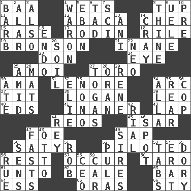 ACROSS 1. Sound made by sheep 4. Soaks 8. Uncastrated adult male sheep 11. 100% 12. Phillipine bananalike plant 14. "Mermaids" star 15. To erase 17. "The Thinker" sculptor 18. Cause heat under the collar 19. "Death Wish" actor 21. Empty; void 23. Spanish title 24. Sight organ 25. Mine, in Marseilles 27. "Corrida" creature 30. Housemaid (var.) 31. Poe poem 34. Curve 37. Teat (slang) 38. Utah city north of Ogden 39. Lion 40. Begley and Asner 41. More lacking in sense or substance 43. Pet locale 44. Vintage cars 45. Austrian river, tributary to the Danube 47. Enemy 49. Plant excrement 50. Letch 52. Manned the helm 56. Relief 57. Come to pass 60. Pacific island yam 61. To (old English) 62. Memphis, Tenn. Street 63. Tavern 64. Double-curved letter 65. Mouths or openings 66. Filthy place DOWN 1. Sharp remark 2. Having or resembling wings 3. In addition 4. Make _____ (do battle with) 5. Inky black, to poets 6. Bit 7. _-fi 8. One or ones belonging to thee 9. Ubangi River tributary 10. Before (prefix) 13. Cuckoo 14. Supercomputer manufacturer 16. Inside; within (prefix) 20. Earth 22. Modern: prefix 25. Among 26. Floor coverings 27. Ancient Roman robes 28. Northwest Algerian city 29. French philosopher Descartes 30. Had dinner 32. Writer Wiesel 33. Words to Nanette 34. Silent film actress Nazimova 35. Posterior 36. Police officer (slang) 42. Monetary unit of Yemen 44. Marina Del _, California 46. Specific locale 47. Goes without food and/or water 48. "Beetle Bailey" pooch 49. Founders of families 50. Elected reps. 51. Director Reiner 52. Monetary unit of Botswana 53. Bar bills 54. Part of Q.E.F. 55. Rowboat 56. Sorrow 58. Corporate head (abbr.) 59. Auto