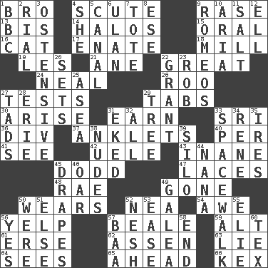 ACROSS 1. Sis' sibling 4. Scutum 9. To erase 13. Altar cloth linen 14. Saint headwear 15. Taken by mouth 16. Domesticated feline 17. Maternal 18. Place where flour is made 19. French article 21. One (Scot) 22. Relatively large 24. Anneal 26. Friend of Pooh 27. Trials 29. Bar bills 30. Originate 31. Merit 33. Indian title of respect (Mr.) 36. HTML Container Element 37. Short socks 40. For each 41. Perceive with the eye 42. Ubangi River tributary 43. Lacking in sense or substance 45. Texas town _ City 47. Shoestrings 48. Actress Charlotte 49. Went 50. Erodes 52. Teachers' org. 54. Deep reverence 56. Sharp bark 57. Memphis, Tenn. Street 59. The first octave above the treble staff 61. Celtic language 62. NE Netherlands city 63. Untruth 64. Perceives with the eye 65. At or in the front 66. Dry husk or covering DOWN 1. English channel? 2. Monetary unit of Yemen 3. Clearly or manifestly demonstrative 4. A female animal or person 5. Lessep's creation 6. ____ Bator, Mongolia 7. Haul 8. Compass dir. 9. Lover boys 10. Roberta Peters solo 11. Table seasoning 12. Pipe bend 20. Puts into a specified state 22. Monetary aid 23. Director Reiner 25. Toward the sea 27. Small boys 28. 4th largest of the Great Lakes 29. Relationship diagram 31. Supplemented with great effort 32. Everything 33. High altitude stroll 34. French philosopher Descartes 35. Angers 38. Unclothed pictures 39. Grain storage tower 44. Grandmother 45. Window treatments 46. Boat paddle 49. An organ shaped like a helmet 50. Past tense of be (plural) 51. Otherwise 52. Tender 53. Relaxation 55. Writer Wiesel 56. Affirmative reply 57. Sound made by sheep 58. Conclusion 60. John Ritter's dad