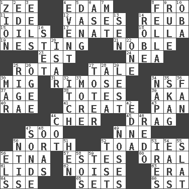 ACROSS 1. Last letter of the English alphabet 4. Dutch treat 8. Back 11. Binary compound 12. Flower holders 14. Reuben's nickname 15. Petroleums 17. Maternal 18. Water jar 19. Snuggling 21. Impressive in appearance 23. Eastern Standard Time (abbr.) 24. Teachers' org. 25. Round or rotation of duties 27. Falsehood 30. Russian fighter aircraft 31. Full of chinks, cracks, or crevices 34. Science/research agcy. 37. Ripen 38. Hauls 39. Alias (abbr.) 40. Actress Charlotte 41. Make 43. Baking dish 44. "Mermaids" star 45. To trail on the ground 47. "Barney Miller" actor Jack 49. Compass dir. 50. Compass direction 52. Sycophants 56. Inactive volcano in Sicily 57. _____ Park, CO 60. Of the mouth 61. Hats (slang) 62. Annoying sound 63. Epoch 64. Compass dir. 65. Puts into a specified state 66. Fast jet (abbr.) DOWN 1. The Jewish people; Israel 2. Singer Brickell 3. Snakelike fish 4. Incident 5. Mild oath, euphamism for damn 6. White ___ sheet 7. Was introduced to 8. Man or boy (slang) 9. Governing power 10. Chief or king in Benin or Nigeria 13. Elected rep. 14. Loose flowing garment 16. Proofreading order 20. Austrian river, tributary to the Danube 22. Single 25. Capital of Latvia 26. Double curve, resembling the letter S 27. Carrier 28. At sea 29. For fear that 30. Impair 32. Hankering 33. Greater amount 34. California wine valley 35. Heroin 36. Air blower 42. Pulitzer Prize-winning author Ferber 44. Small bed 46. Do over again 47. Something which is sent 48. Mouths or openings 49. Olfactory organs 50. Nuclear Threat Initiatives 51. Layer 52. Trial 53. Angers 54. Hearing organs 55. Narrow board 56. Raised railways 58. Distress signal 59. Standoff