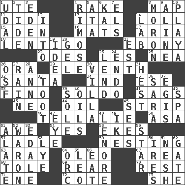 ACROSS 1. Shoshoni 4. Immoral or dissolute person 8. Atlas unit 11. "You Light Up My Life" star Conn 13. Slanted text style (abbr.) 14. Hang loosely or laxly 15. An important port of Yemen 16. Floor coverings 17. Operatic vocal solo 18. Small, flat, pigmented spot on the skin 21. Dark wood 22. Lyric poems 23. French article 25. Teachers' org. 26. Mouth or opening 29. Veterans Day date 32. Before Barbara or Clara 34. Working for oneself (abbr.) 35. Compass dir. 38. A pale, very dry sherry 39. Twentieth part of a lira 41. Sinks 43. Modern: prefix 44. Petroleum 45. Long narrow piece of something 46. Copy Pinocchio 50. White ___ sheet 51. Deep reverence 54. Consenting reply 55. Makes supply last 57. Dipping utensil 59. Nestling 63. Like ___ of sunshine 64. Margarine 67. Length times width 68. Lacquered or enameled metalware 69. Tail end 70. Respite 71. Compass dir. 72. ____ d'Azur (French Riviera) 73. A female animal or person DOWN 1. Freehold land 2. Periodic rise and fall of the sea level 3. Locale of original sin 4. Full of chinks, cracks, or crevices 5. "One Day ___ Time" 6. Krazy ___ of comics 7. Raised railways 8. Person of subnormal intelligence 9. Place in a line 10. Beach, in Buenos Aires 12. To the inside or interior of 14. Experiment locale 19. It may be bright or harebrained 20. Set 21. Eastern Standard Time (abbr.) 23. Grant temporary use of 24. Inside; within (prefix) 26. Order of Saint Francis (abbr.) 27. Water falling in drops from the sky 28. Singer Murray 30. Country estate 31. Behest 33. A blast of a horn 36. "Two Mules for Sister ____" 37. The front part of a cuirass 39. Flatfish 40. Petroleums 42. Health resort 45. Observes 47. Sight organ 48. Poe poem 49. Mamie's mate 51. Having winglike extensions 52. Make _____ (do battle with) 53. Peak District village in England 56. Play the lead 58. Sodium hydroxide 60. Angers 61. Tender 62. Yard entry 64. The grampus (Milton) 65. Lion 66. Consume