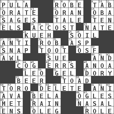 ACROSS 1. Monetary unit of Botswana 5. Loose flowing garment 9. Bar bill 12. Speak pompously 14. Northwest Algerian city 15. Chief or king in Benin or Nigeria 16. Gurus 17. Lie 18. "___ Little Indians" 19. Raised railways 20. Buttonhole 23. Nathan's nickname 24. Malaysian steamed pastry 25. Earth 27. Against 30. Director Reiner 32. Cleo's killer 33. Fastener 34. A blast of a horn 36. Order of Saint Francis (abbr.) 38. Leather borer 39. Institute legal proceedings 40. Also 43. Gear tooth 46. Blunders 48. Small Philippine buffalo 49. Lion 51. Set 52. Small, narrow, flatbottom fishing boat 53. Fermented drink made from hops 54. Frog relative 56. "Corrida" creature 58. Erase 61. Black tropical American cuckoo 64. Actress Gardner 65. Actor Lugosi 66. Stares 68. Was introduced to 69. Precipitation 70. Relating to the nose 71. Followers of ems 72. Cassini of fashion 73. Hero or heavy, e.g. DOWN 1. Introduce or present, as a question 2. Mountain range 3. Falls behind 4. Had dinner 5. Printing process, for short 6. Mouths or openings 7. Greek mezzo-soprano Agnes 8. Compass dir. 9. Add up to 10. Collude with 11. Object of repulsion 13. He sold his birthright 21. An absolute certainty 22. Opt 23. Pinches, bites 24. Monetary unit of Laos 26. Bear (Spanish) 27. White ___ sheet 28. Compass dir. 29. Baby powder 31. French market town 35. Cylindrical with tapered ends 37. Papal veil 41. Or not 42. 24 hours 44. Butter sub 45. Turn to the right 47. Slit 48. Increase 50. Severe or trying experience 53. Naughty children 55. Age 56. Not wild 57. Baking chamber 59. Writer Wiesel 60. Austrian-born American filmmaker Fritz 61. In addition 62. Be tempered by heat 63. Small island 65. Sis' sibling 67. Slender fish