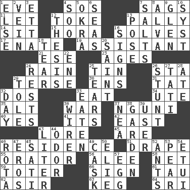 ACROSS 1. First lady 4. Mayday 7. Settles 11. Allow 12. Casino tip 13. Friendly 14. Be seated 15. Israeli folk dance 16. Finds the solution 17. Related on the mother's side 19. Aide 21. Compass dir. 23. Eras 24. Precipitation 25. Shallow baking pan 26. R.R. building 29. Laconic 30. Followers of ems 31. Make lace 32. Two (Sp.) 33. Ingest 34. Shoshoni 35. Keyboard modifier key 36. Armed conflict 37. Group of southern Bantu languages 40. It is so 41. It is 42. Compass direction 43. Old wives' tales, e.g. 45. "We ___ not amused" (Victoria) 46. Home 51. Window treatment 55. Speaker 56. Toward shelter 58. Fish or hair follower 59. Carrier 60. Attach a signature 61. The 19th letter of the Greek alphabet 62. SW Saudi Arabia district 63. Barrel 64. _ Lanka DOWN 1. Otherwise 2. Distinctive style or manner 3. Singer James 4. "Barney Miller" actor Jack 5. Gumbo ingredient 6. Oceans 7. Table seasonings 8. Inventor's middle name 9. Small, secluded valley 10. System (abbr.) 12. College paper 13. Airs 16. Public displays of written messages 18. Lacerate 20. Inhabitant of Heaven 22. Compass dir. 24. Musical pauses 25. Pulls apart 26. Difficult or unusual or dangerous feat 27. Jacques of French films 28. Had dinner 29. Lacquered or enameled metalware 32. 24 hours 33. Ingested 36. One who wires 37. Teachers' org. 38. Place where plants grow 39. One who makes use of a thing 43. 61 cubic inches 44. Scent 46. Round or rotation of duties 47. Greek god of love 48. Suttee (variant) 49. Keg 50. Writer Wiesel 52. Pismires 53. Lightbulb-shaped fruit 54. Needle holder 57. Ovum