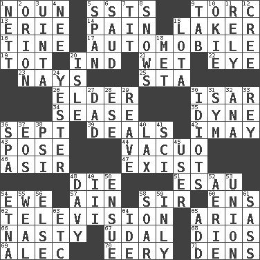 ACROSS 1. Part of speech 5. Fast planes 9. Torque (variant) 13. 4th largest of the Great Lakes 14. Ache 15. Member of a famous L.A. basketball team 16. Prong on a fork 17. Car 19. Small child 20. Working for oneself (abbr.) 21. Soggy 22. Sight organ 23. Negative votes 25. R.R. building 26. A person who is older than you are 30. Austrian river, tributary to the Danube 34. Gospel singer Marvin 35. Unit of force 36. Back-to-school mo. 39. Allots cards 42. "If ____ say so..." 43. Introduce or present, as a question 44. In a vacuum (with "in") 46. SW Saudi Arabia district 47. Have an existence 48. Pass on 51. Son of Isaac 54. She-sheep 57. The 18th letter of the Arabic alphabet 58. Title for a knight 60. Followers of ems 62. Boob tube 65. Roberta Peters solo 66. Characterized by obscenity 67. Hereditary estate 68. "Vaya con ____" 69. Actor Baldwin 70. Suggestive of the supernatural 71. Lairs DOWN 1. Remaining after all deductions 2. Constellation of myth 3. National forest in Provo, Utah 4. Born 5. Connect, as a bridge 6. Saudi Arabian king (1953-1964) 7. Teat (slang) 8. Overwhelms 9. Bar bill 10. Migrant worker of the '30s 11. Trust 12. Algonquian 15. Globular water bottle used in Asia 18. Was introduced to 20. Small island 24. Last past 27. June honoree 28. Compass dir. 29. Rob, plunder, or pillage 30. Foolish or stupid persons 31. Symbol (abbr.) 32. Santa ___, CA 33. Marina Del _, California 36. Health resort 37. Greek goddess of the dawn 38. Air pressure measure (abbr.) 40. Not strict 41. _-fi 45. One who uses or employs something 48. American folk hero Crockett 49. One more than two 50. Follow as a consequence or result 52. Nest on high 53. The state of being joined or united 54. Inactive volcano in Sicily 55. Welt 56. Otherwise 58. Fly high 59. Inwardly 61. Backtalk 63. And so on (abbr.) 64. Binary compound 65. Increase